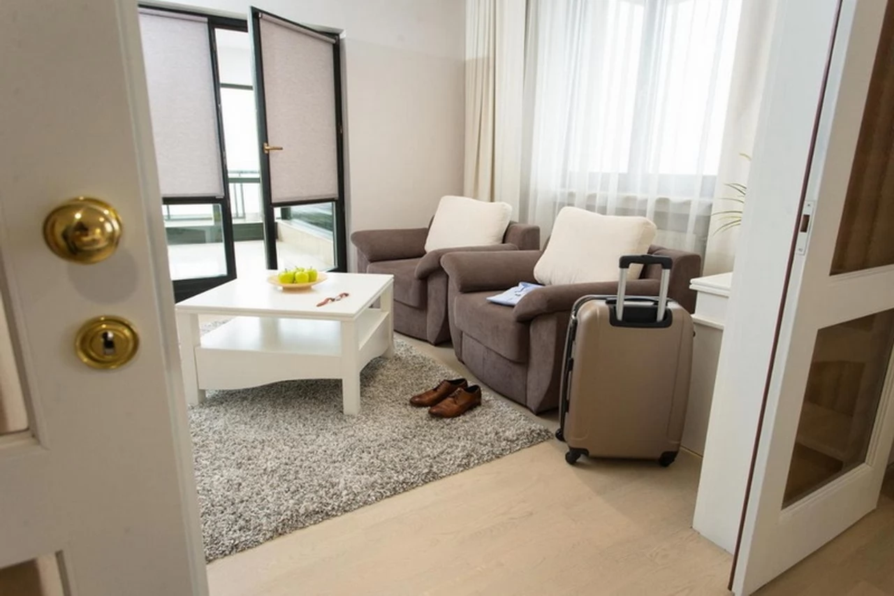 Apartamentele includ un living spațios, două băi, terasă mediteraneană și terasă deschisă; livingul este mobilat cu fotolii din piele, măsuță de cafea și birou.