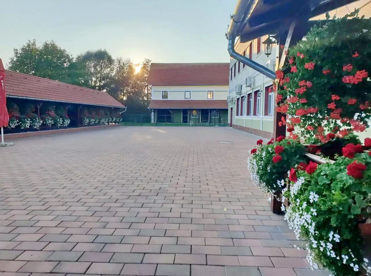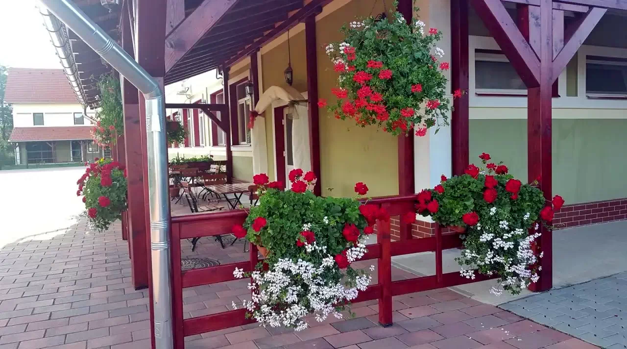 Oferă o curte cu grădină spațioasă și amenajată cu terasa de vară, filegorie, mobilier de grădină, și o parcare închisă mare pentru autoturisme si autobuze.