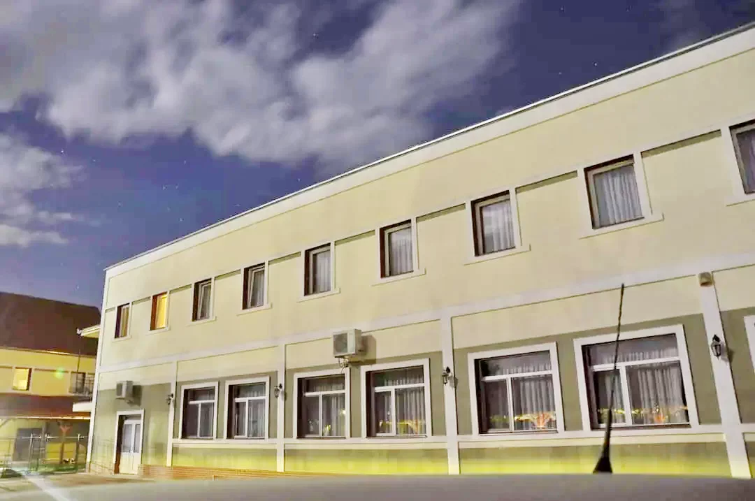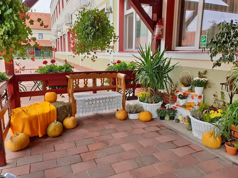 Oferă o curte cu grădină spațioasă și amenajată cu terasa de vară, filegorie, mobilier de grădină, și o parcare închisă mare pentru autoturisme si autobuze.