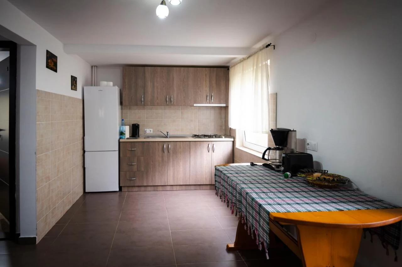 - Pensiunea dispune de 5 camere duble cu pat matrimonial, baie proprie la fiecare camera, Living si Bucătărie.
