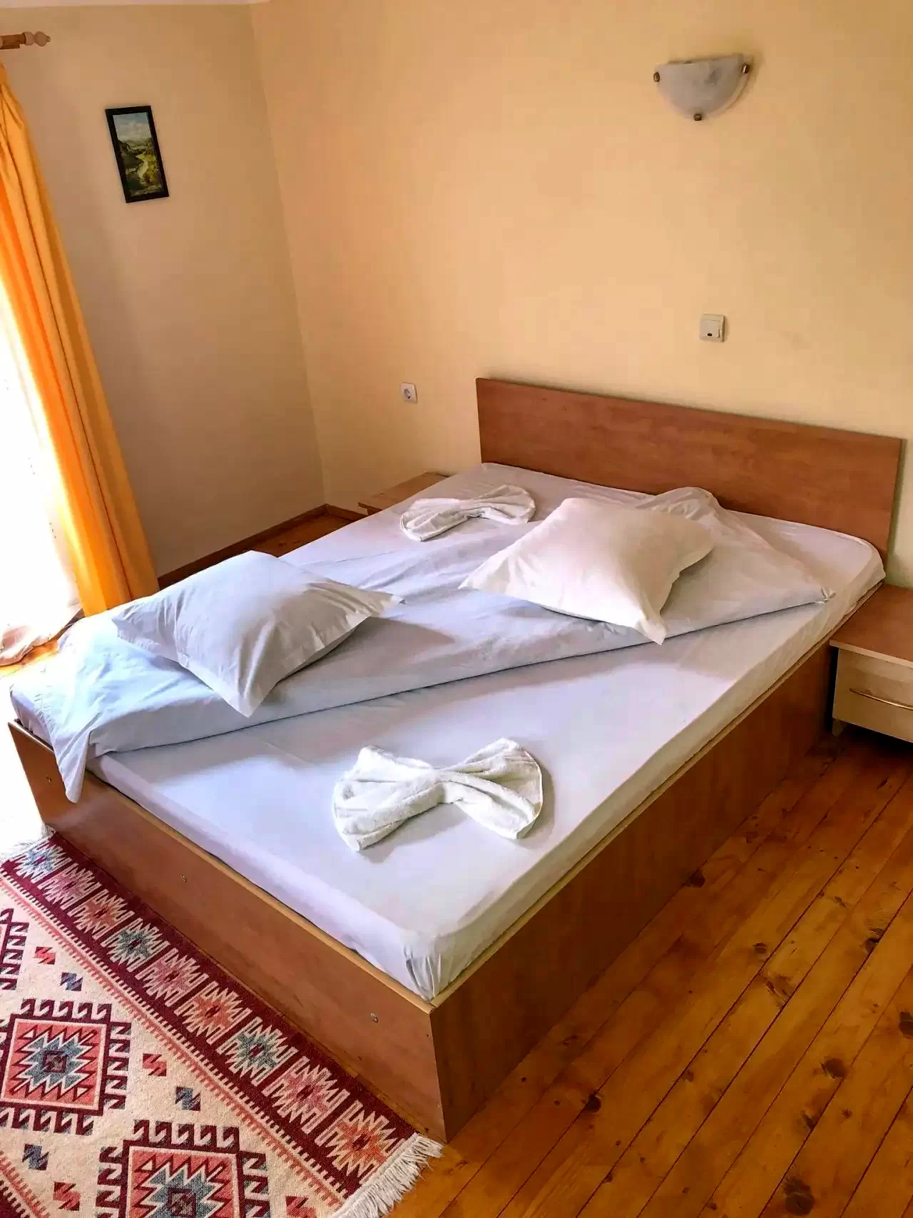 - Tipuri: Camere cu pat matrimonial în stil rustic, cu terasă.