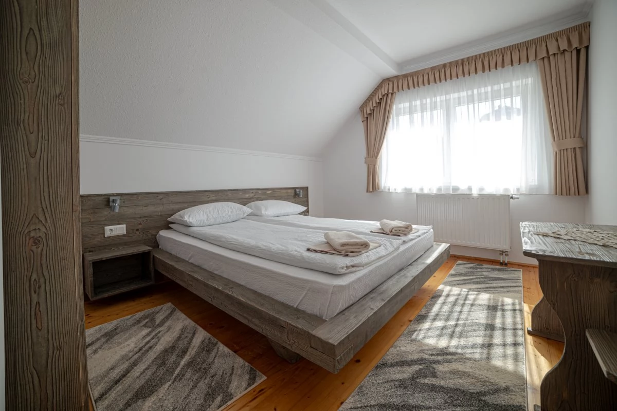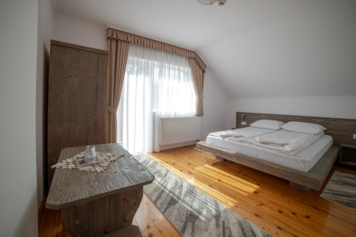 - 1 cameră cu pat dublu și baie proprie (se poate suplimenta cu 1 pat )