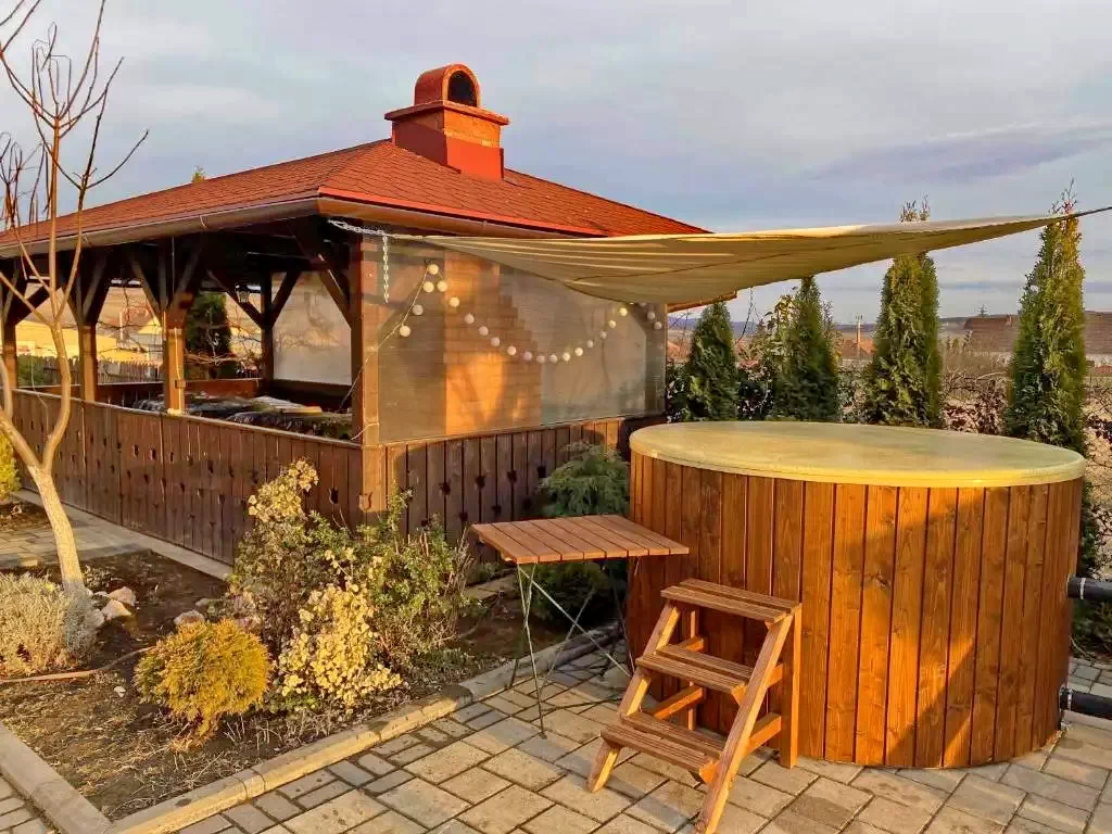 - Copiii au la dispoziție trambulină, leagăne și o groapă de nisip, în timp ce adulții se pot bucura de atmosfera relaxantă în foișor sau lângă grătar.