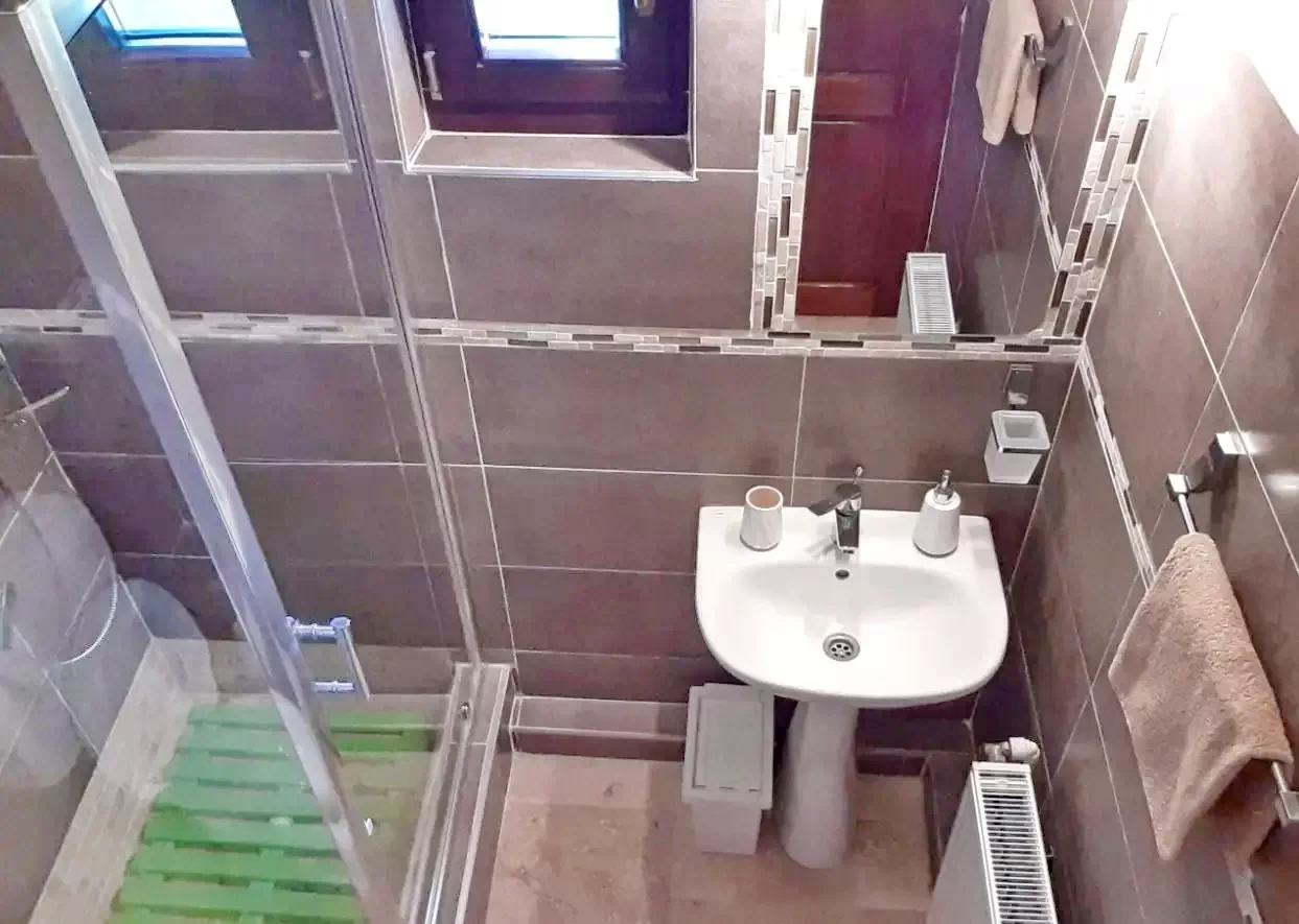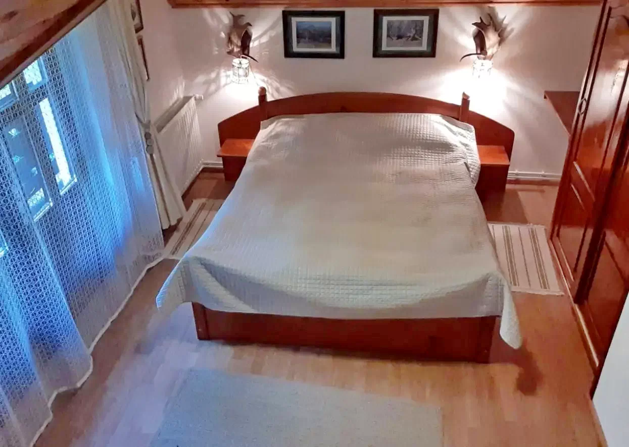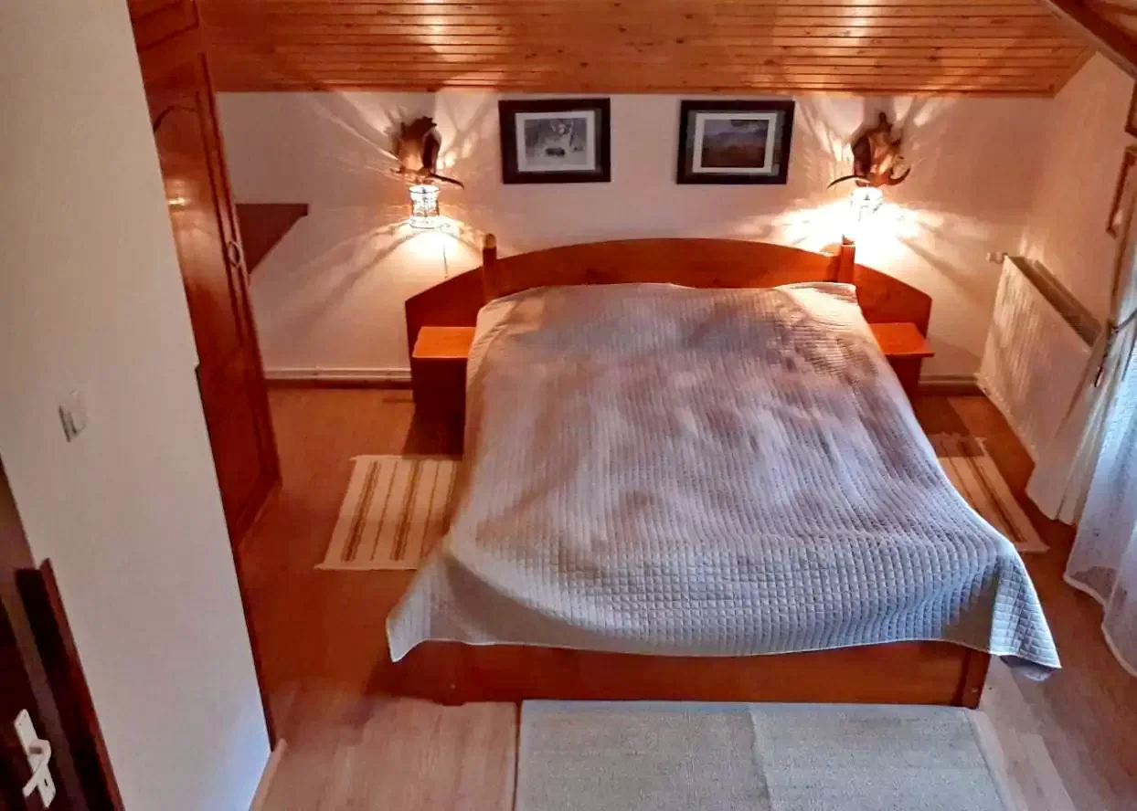 - Etaj: Două camere (fiecare cu 1 pat dublu și 1 pat single) și o a doua baie (cadă-duș, WC, chiuvetă).