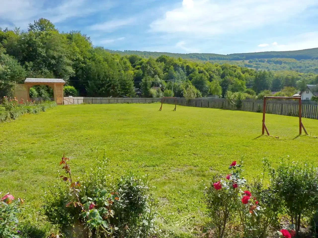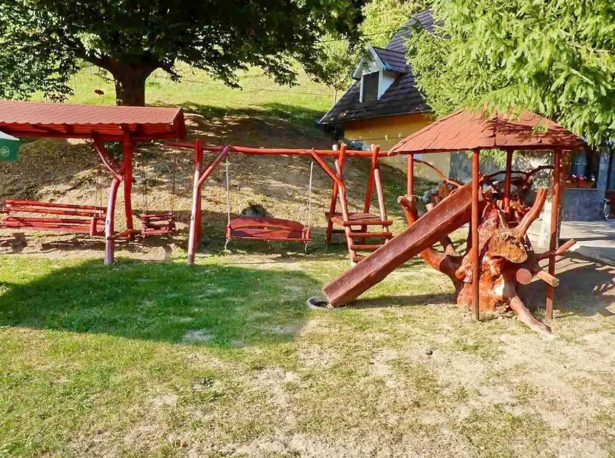 - Curtea de 1000 m² oferă numeroase posibilități de divertisment: leagăn, tobogan, coș de baschet, masă de ping-pong și un teren de fotbal asigură distracție activă pentru copii și adulți.