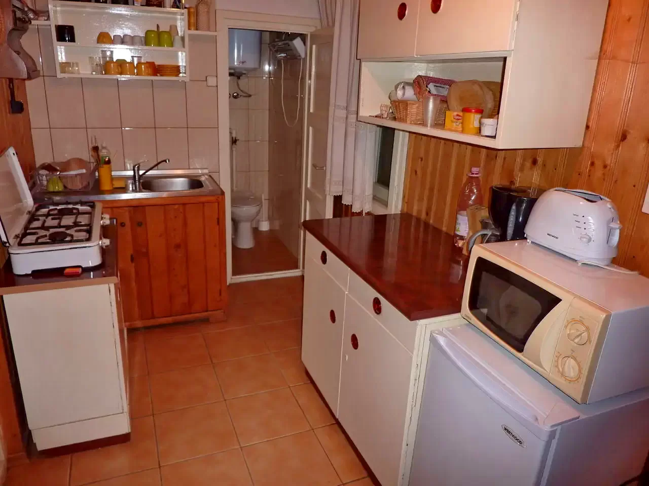 - Bucătărie complet echipată (aragaz pe gaz, frigider, cuptor cu microunde, prăjitor de pâine, cafetieră, fierbător de apă, vase, tacâmuri)