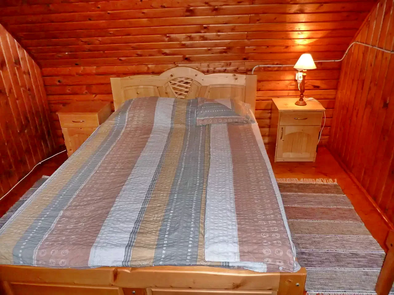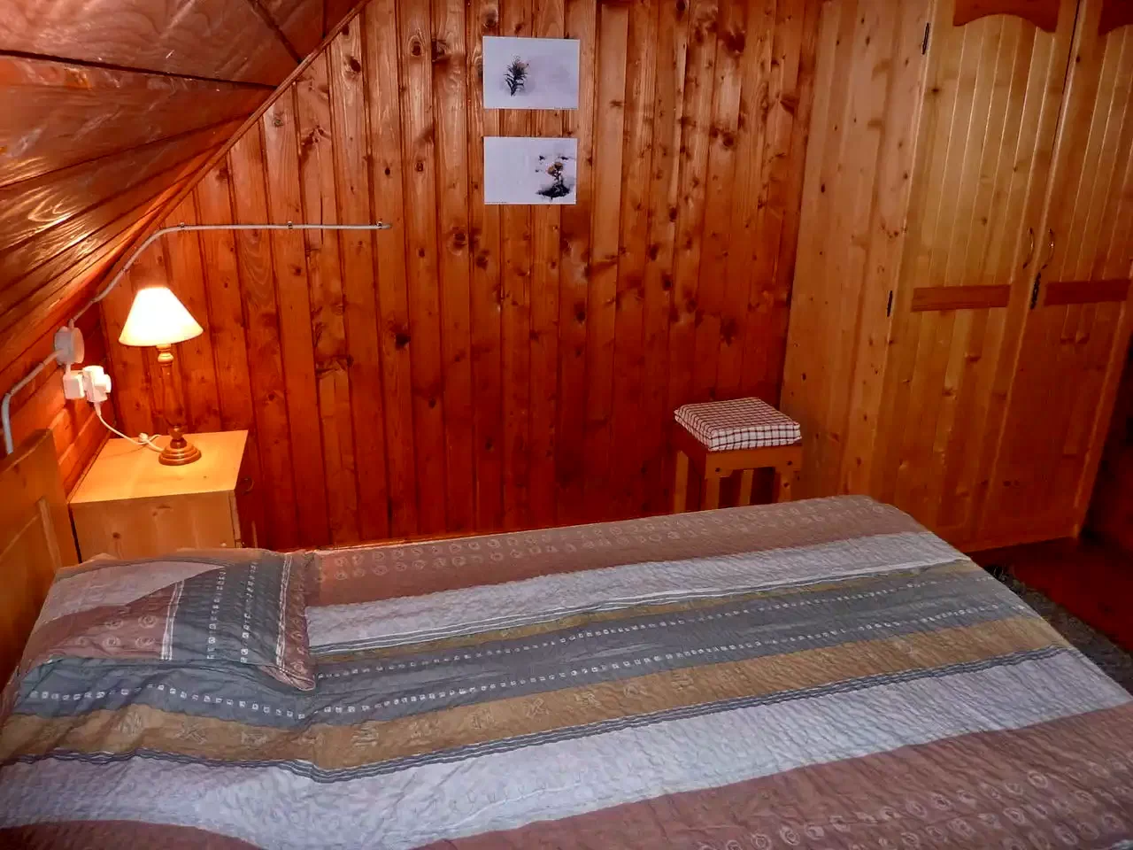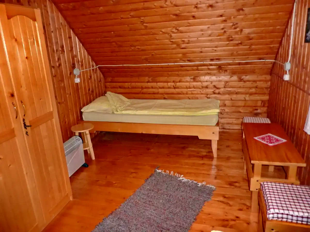 - Etajul găzduiește două dormitoare: unul cu două paturi de o persoană (la cerere se poate adăuga o saltea suplimentară) și unul cu un pat matrimonial.
