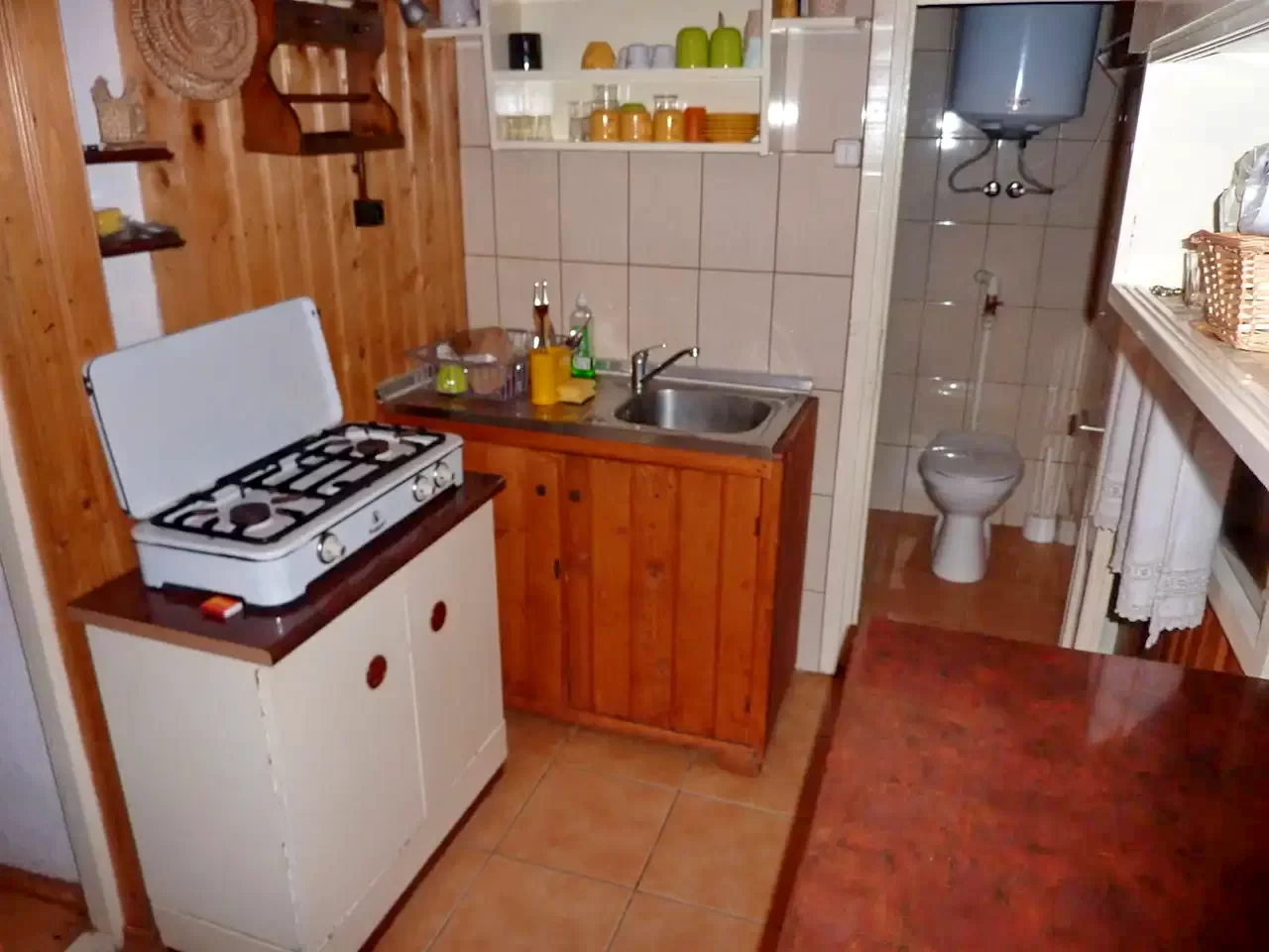 - La parter se află un living-sufragerie primitor, o bucătărie complet utilată și o baie cu duș (dotată cu WC cu rezervor și lavoar).