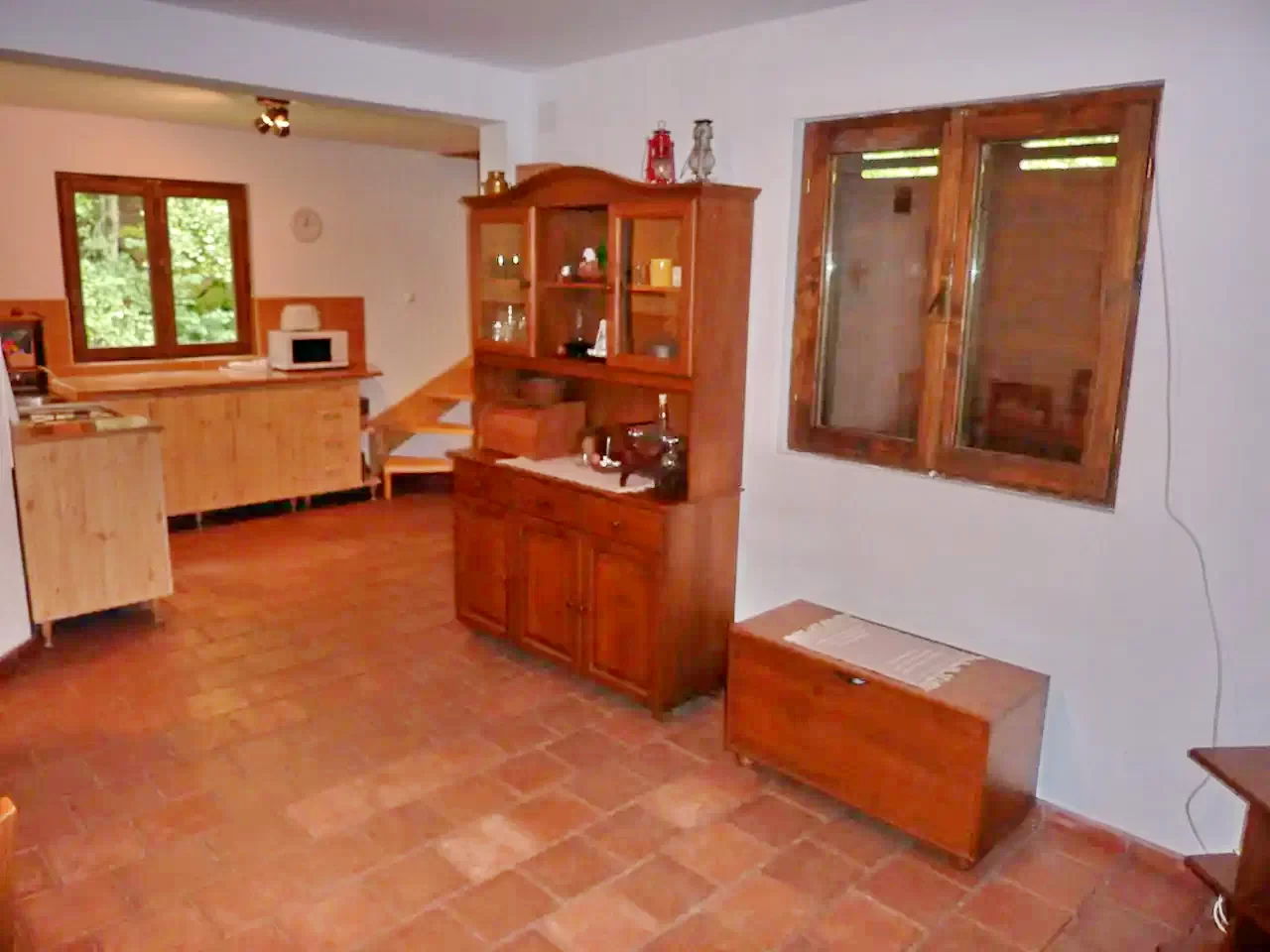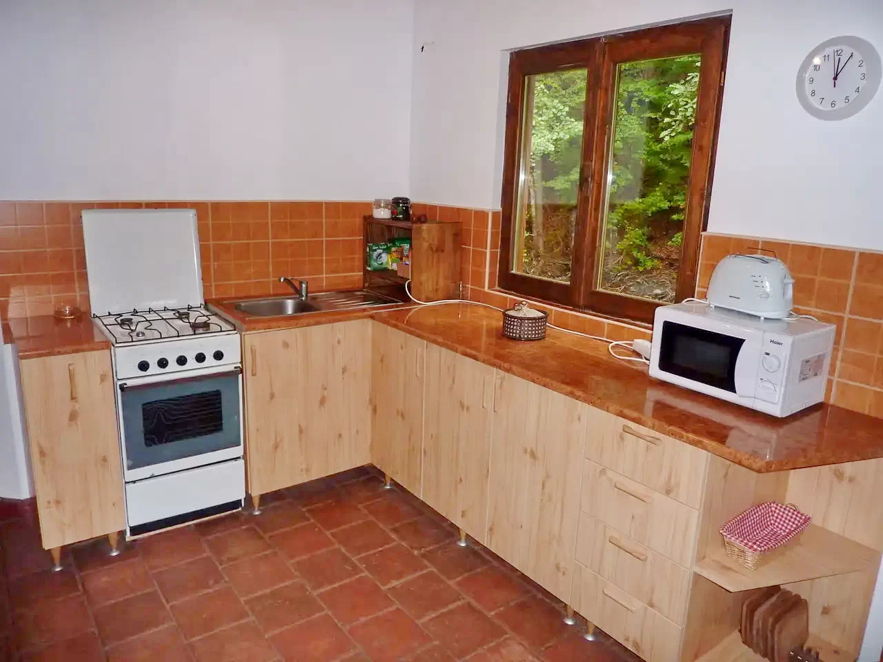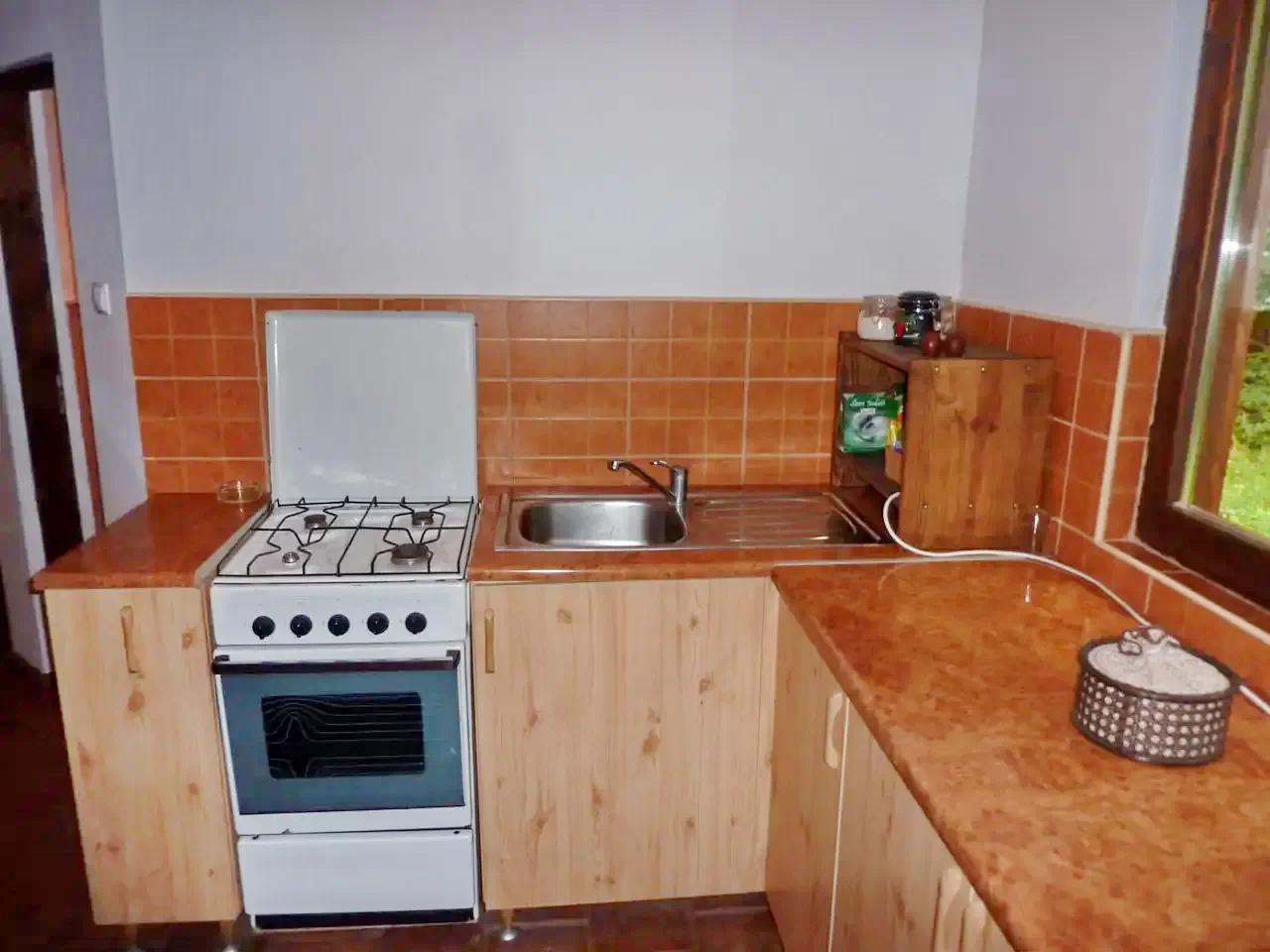 - Bucătăria modernă a cabanei este echipată cu toate cele necesare: aragaz, frigider, cuptor cu microunde, prăjitor de pâine, aparat de cafea, fierbător de apă, vase și tacâmuri pentru gătit.