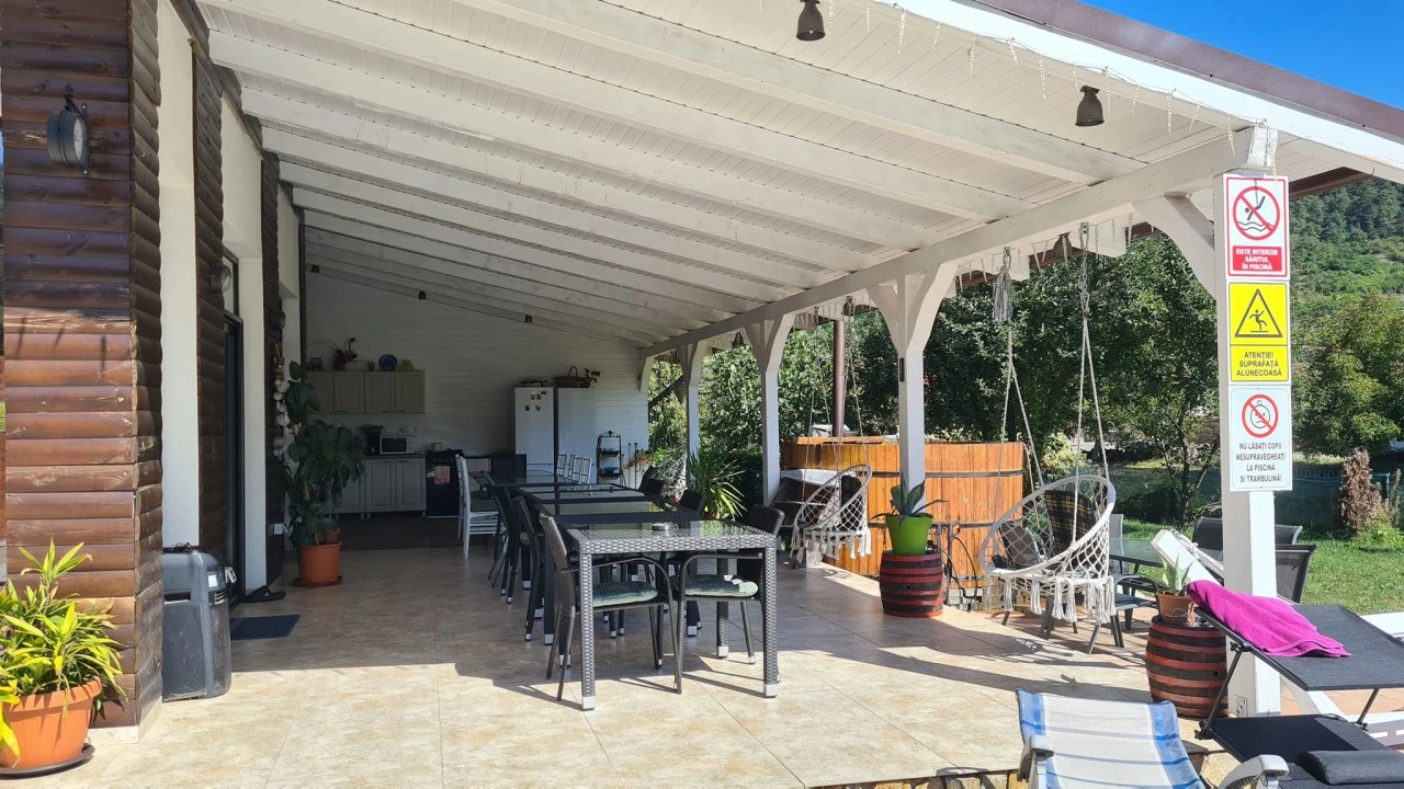 Exterior: Grădină de 1000 m², piscină încălzită, ciubăr (contra cost), grătar, foișor, terasă, loc de joacă, parcare gratuită, închiriere biciclete.
