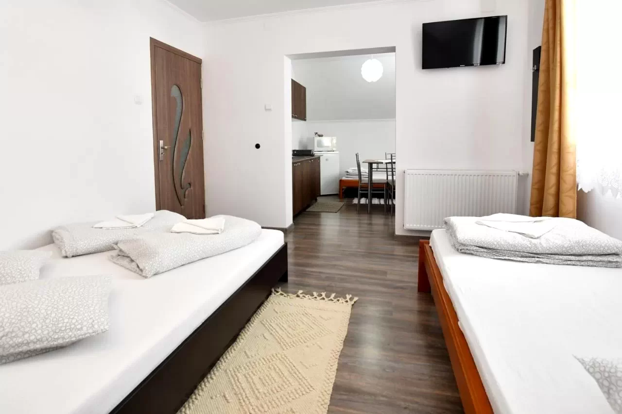 - Ofera cazare confort total pentru 12 persoane in 3 apartamente decomandate (tip garzon), dotat fiecare cu un dormitor, o bucatarie utilata si o baie proprie interioara.