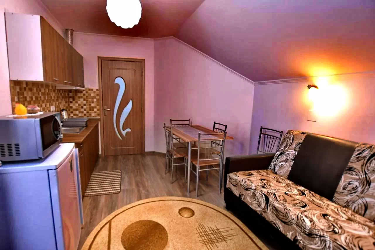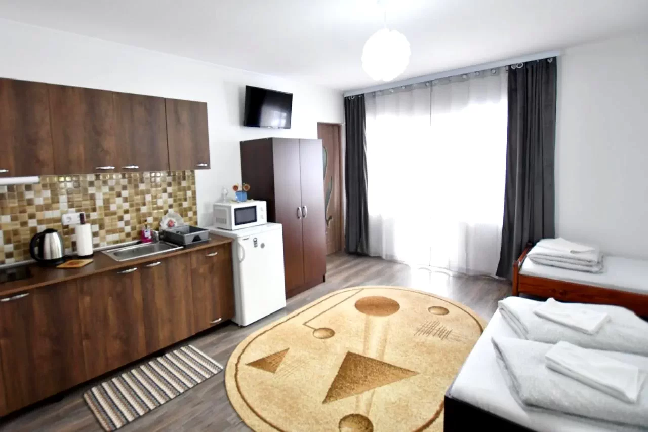 - Are o cameră de zi cu canapea extensibilă, bucatarie dotata si baie proprie.