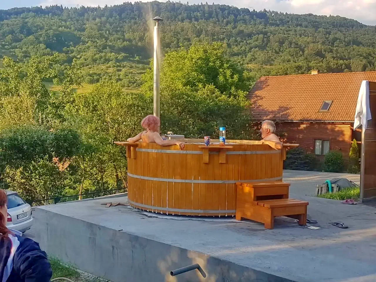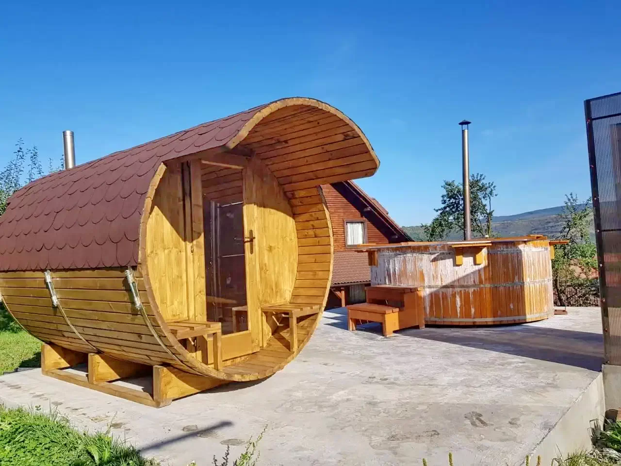 - Ofera oaspetilor gradina mare cu foisor, gratar, loc de parcare, teren de joaca pentu copii cu topogan, leagan, casuta mica, sauna si ciubar, foisor acoperit cu gratar si teren de sport.