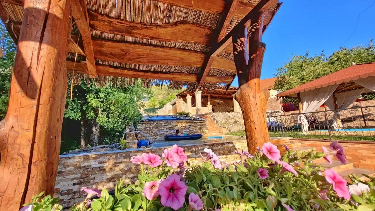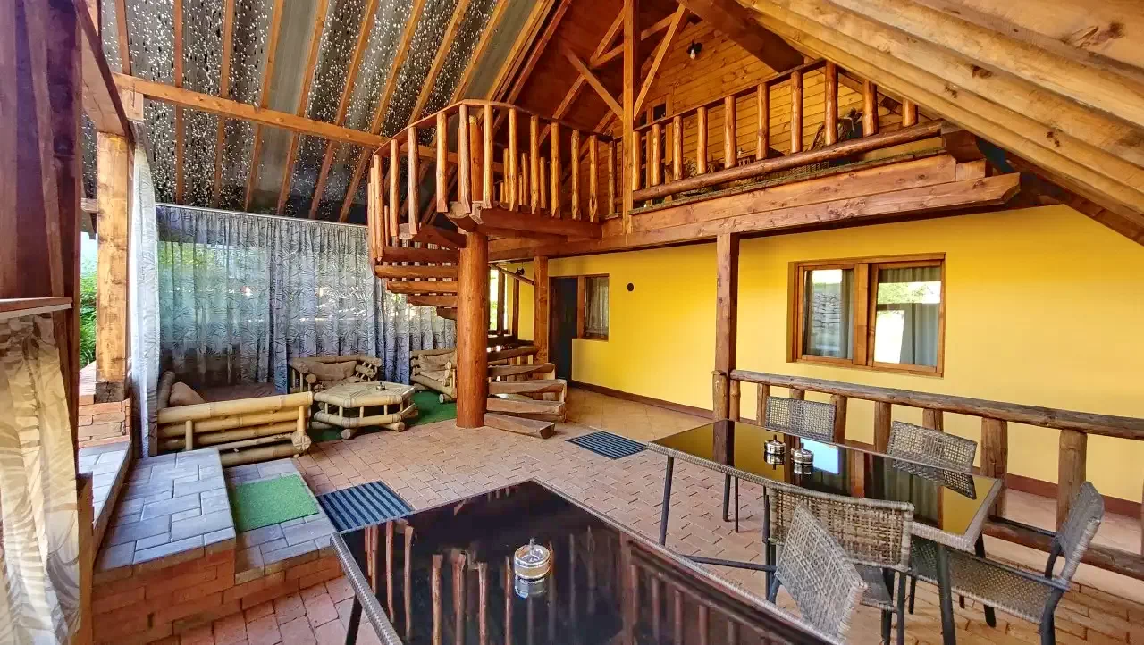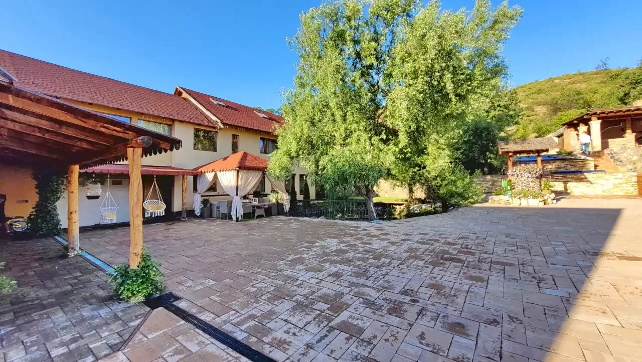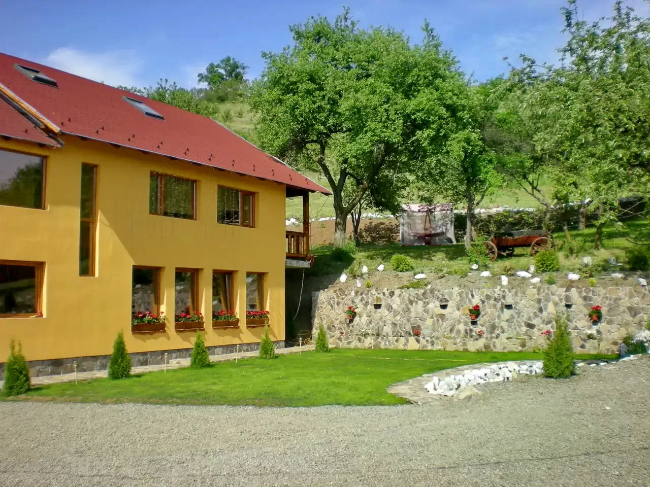 - Curtea și zona de agrement au o vedere excelentă asupra munților din jur și a așezării.
