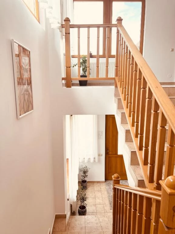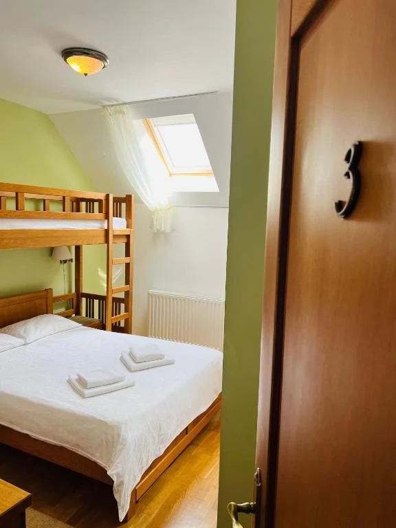 - La etaj sunt disponibile 4 camere cu 4 paturi și o cameră cu 3 paturi, toate cu baie proprie. Mansarda găzduiește 3 camere duble cu baie proprie.