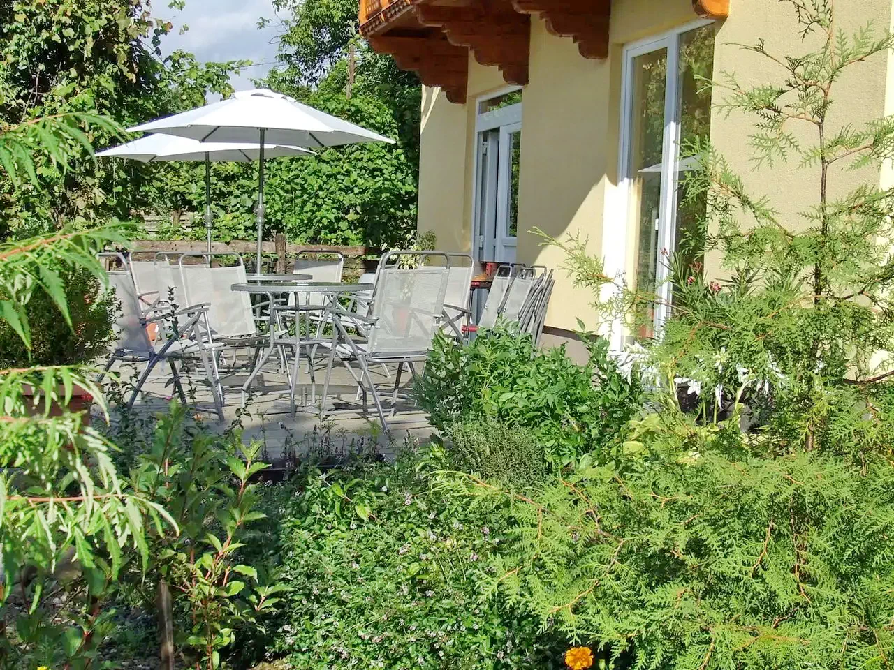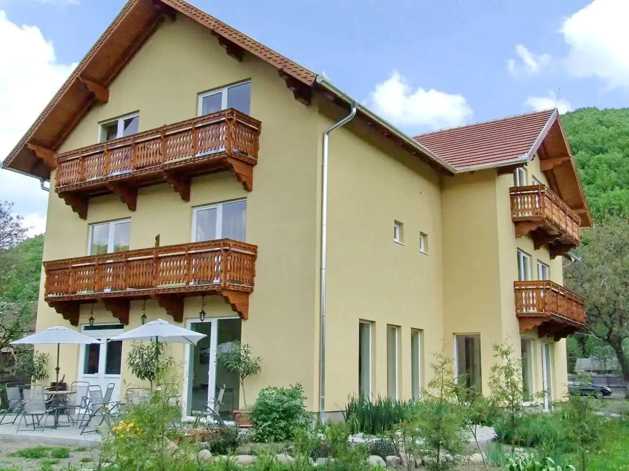 - Clădirea și grădina sunt conectate printr-o terasă mare cu vedere liniștitoare la munții de vizavi. Aerul sănătos și sărat de munte te face să te simți bine iarna și vara.
