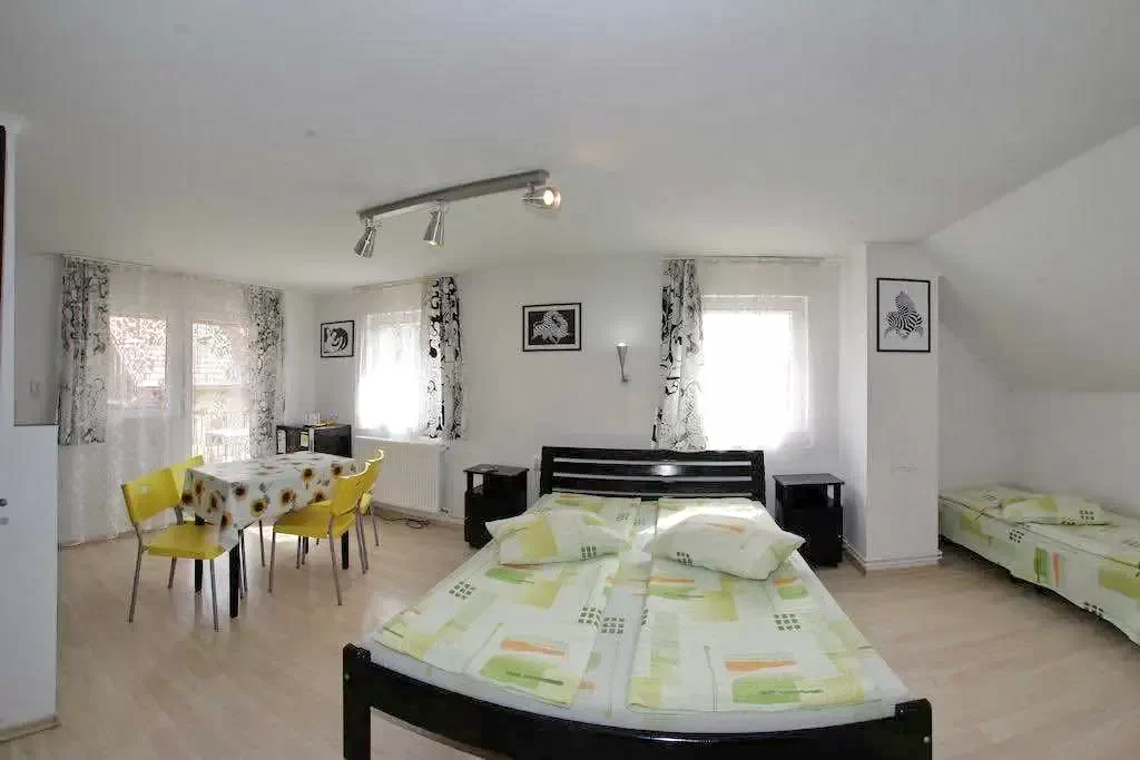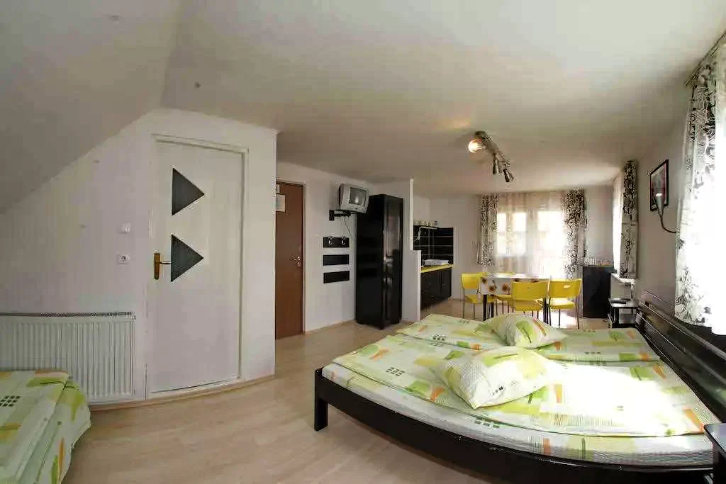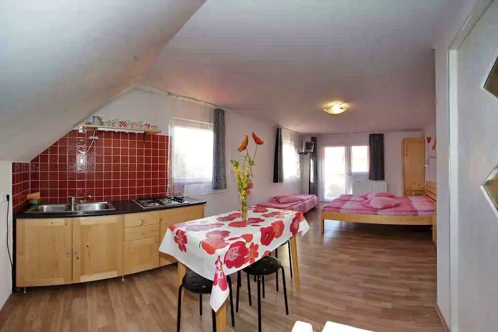 - Apartament studio cu balcon: 3 apartamente de 3 persoane (fiecare cu 1 pat dublu și 1 pat de o persoană, baie, bucătărie)
