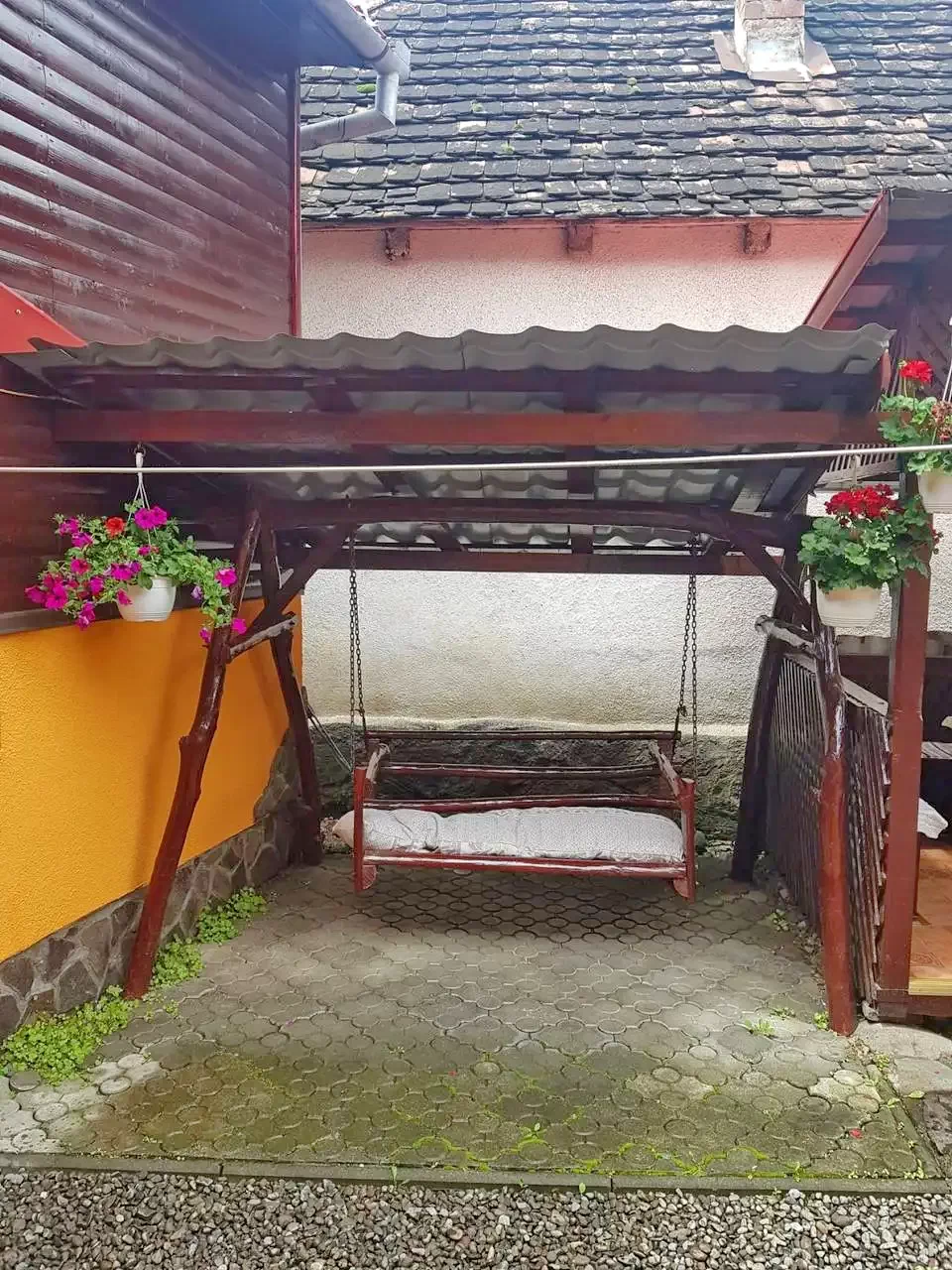 - În curte există și un loc de joacă, care oferă distracție pentru copii, în timp ce adulții se pot relaxa confortabil la umbra pergolei.