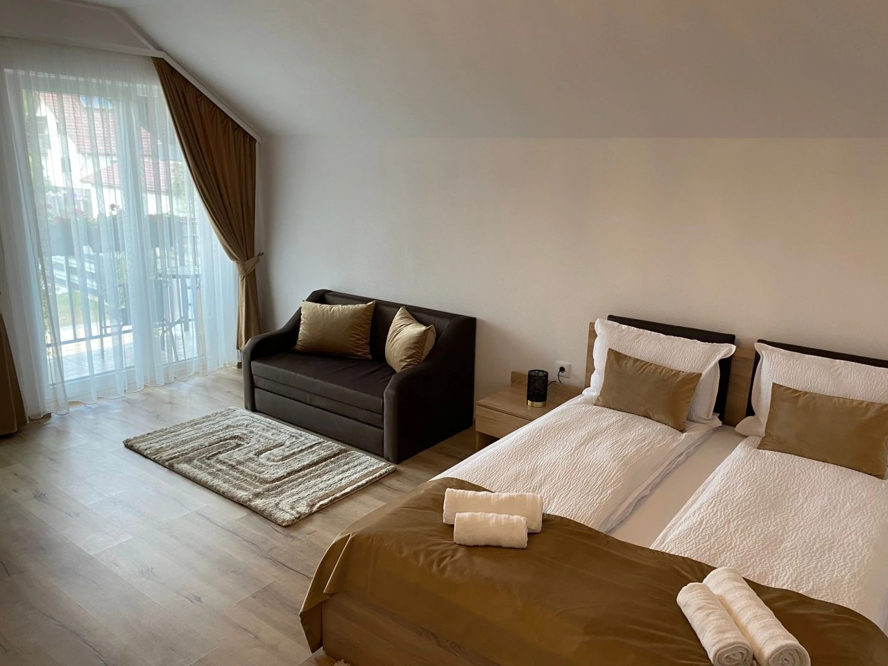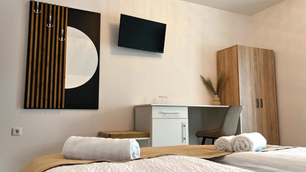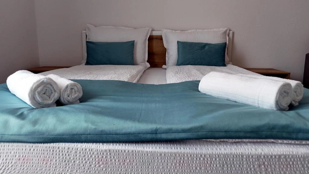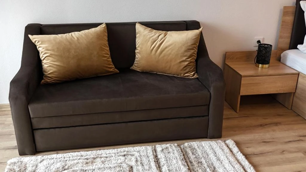 - Fiecare cameră este dotată cu pat matrimonial și canapea extensibilă, Smart TV, minibar (frigider mic), Wi-Fi gratuit și baie proprie complet utilată, inclusiv uscător de păr.