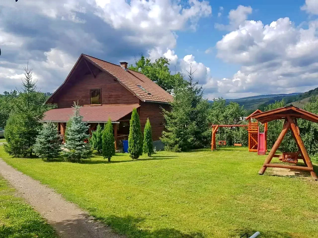- Gradina mare cu foisor, gratar, loc de parcare, teren de joaca pentu copii cu topogan, leagan, casuta mica, sauna si ciubar, foisor acoperit cu gratar si teren de sport.
