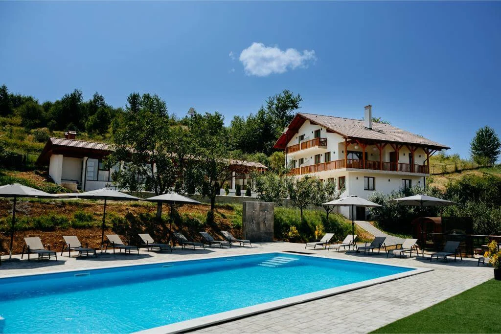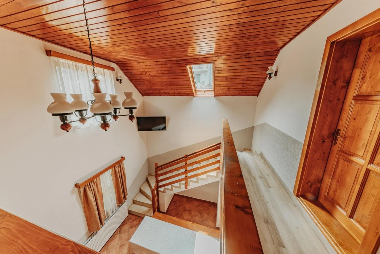 - Pensiunea este amplasată chiar lângă o piscină exterioară, astfel apropierea de centrul wellness asigură relaxare deosebită. Mobilierul primitor al camerelor și panorama către Munții Harghita oferă o experiență de neuitat.