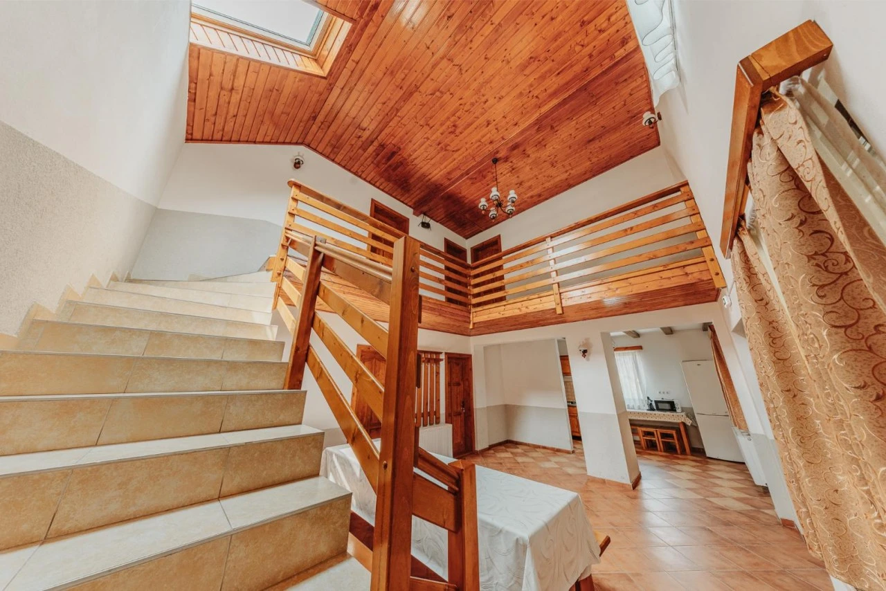 - Oaspeții au la dispoziție o bucătărie complet utilată și un living-sală de mese spațios, ideal pentru reuniuni de familie sau relaxare între prieteni.