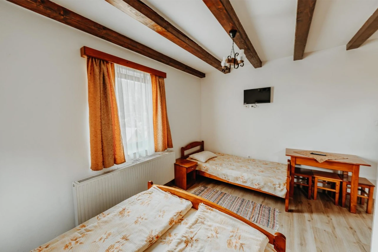 - 4 camere triple: suprafață de 18 m², cu 1 pat matrimonial (1,5 m x 1,9 m) și 1 pat simplu (1 m x 1,9 m), fiecare cu baie proprie, duș, Wi-Fi și TV LED.