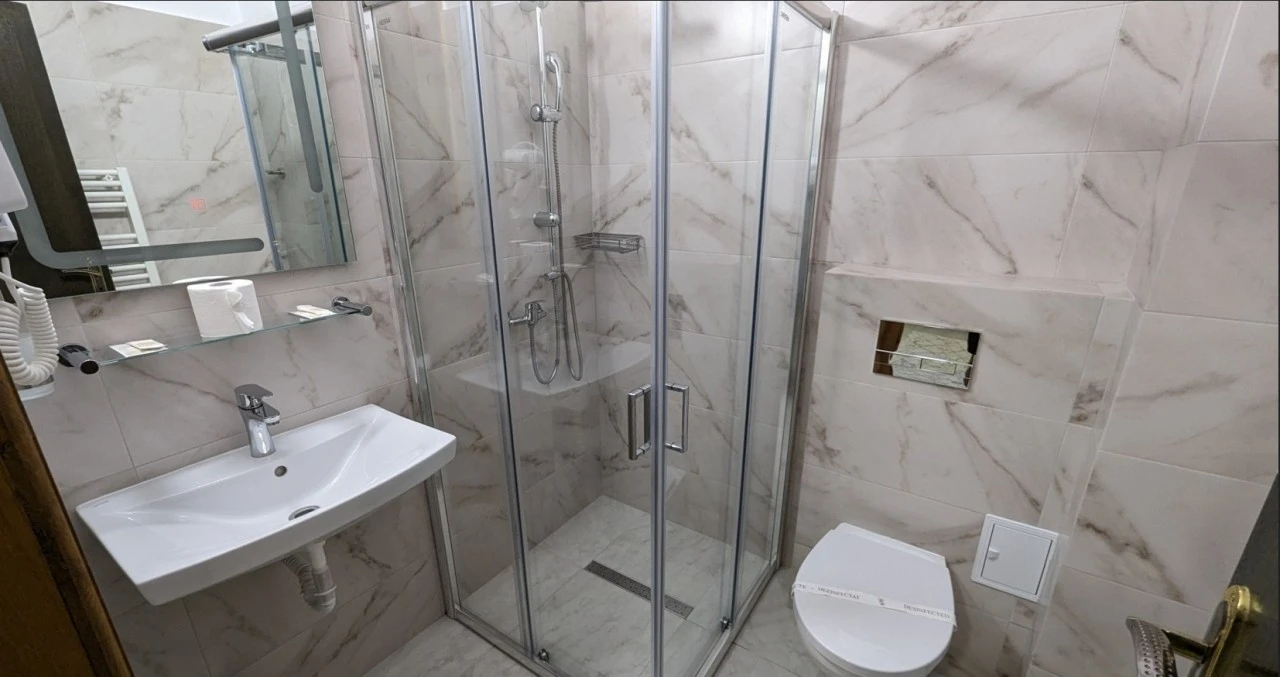 - Baie proprie cu duș sau cadă și uscător de păr
