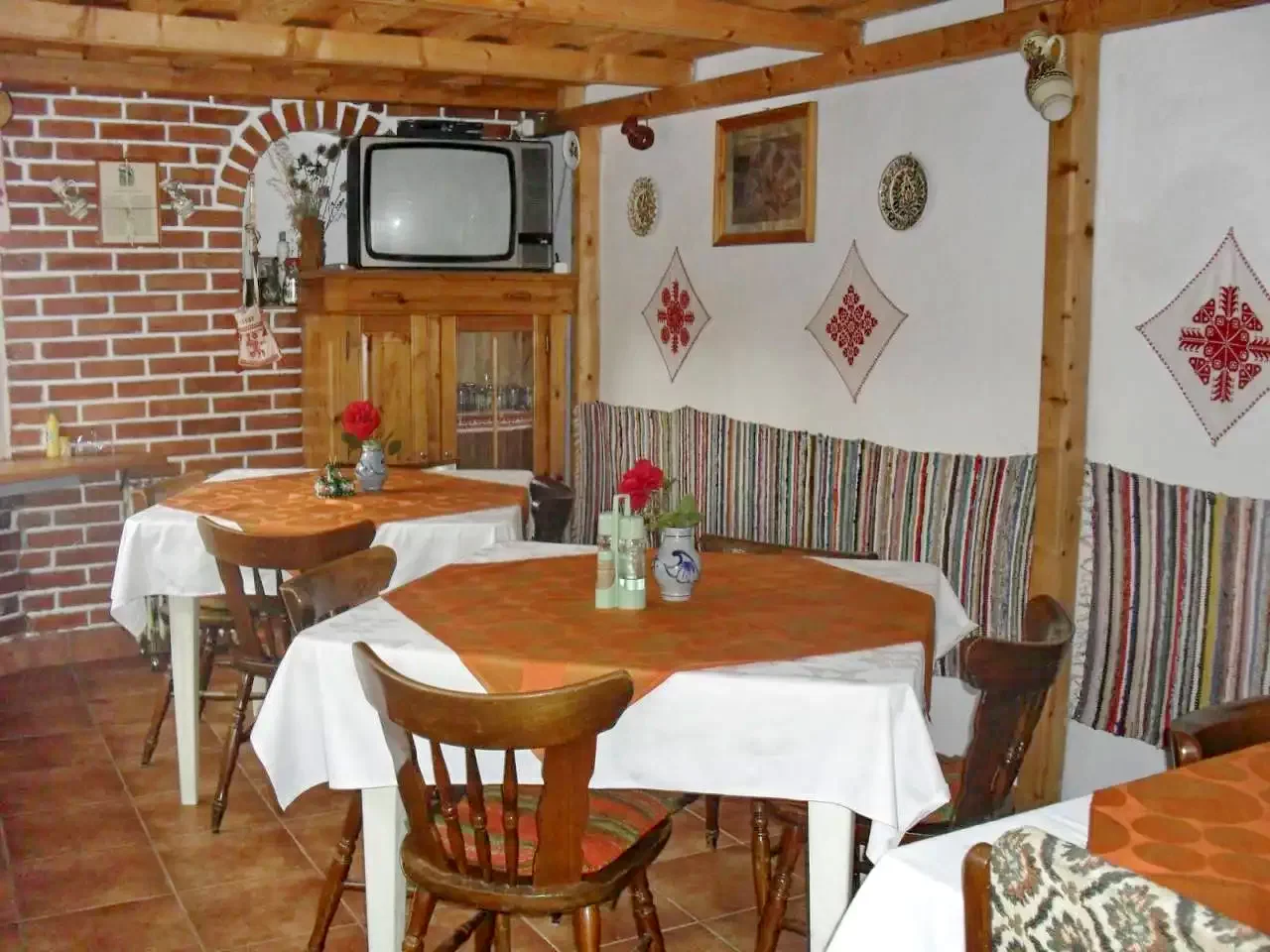 - Mesele sunt servite într-o sală de mese amenajată într-un stil tradițional.
