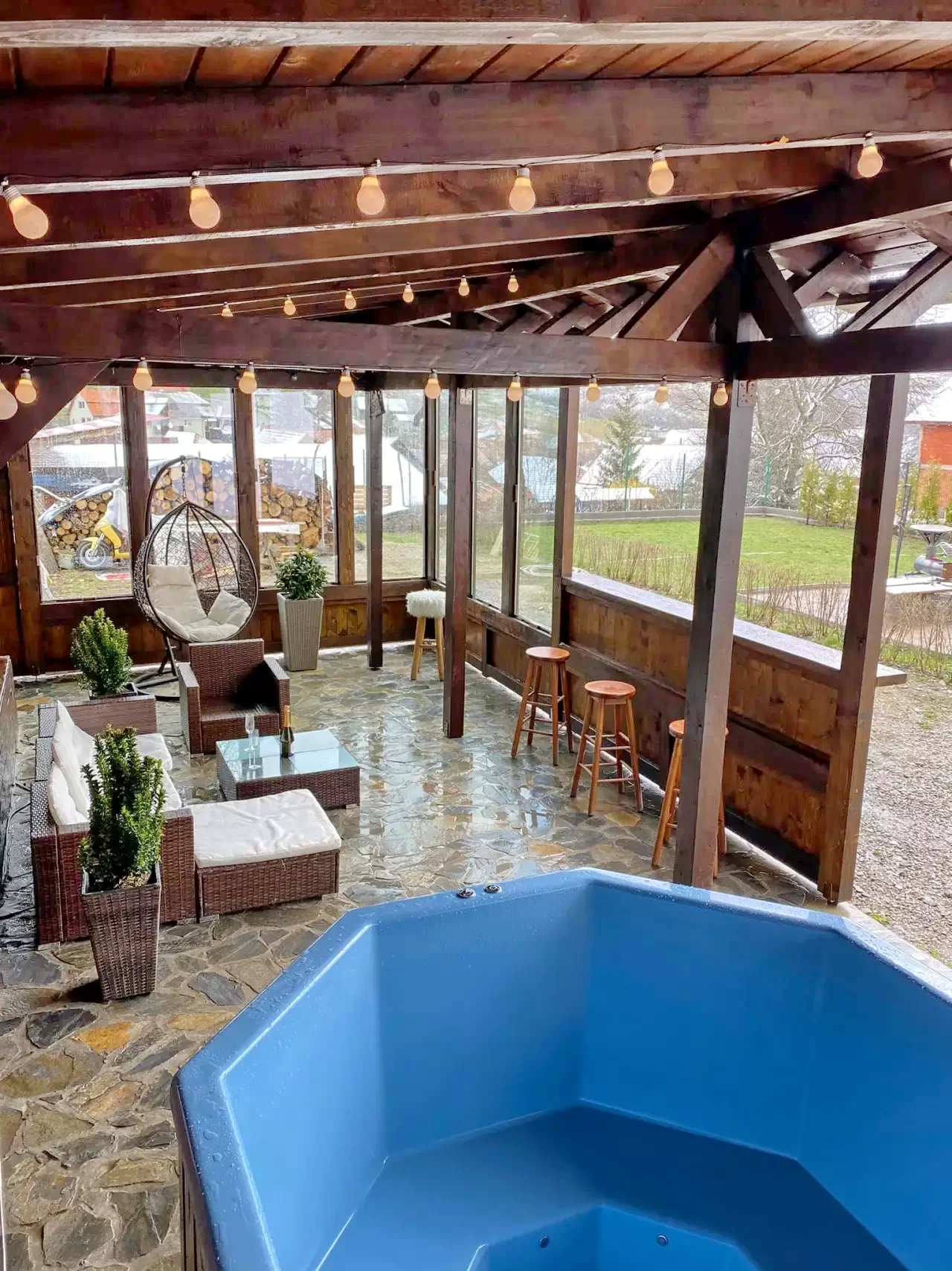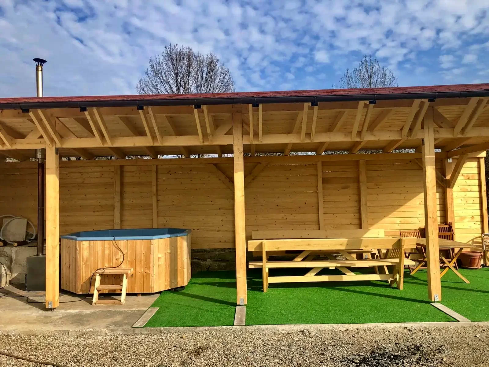 - În curte, oaspeții pot beneficia facilitați de Wellness - de un ciubăr cu apă caldă și o cada cu hidromasaj, situate într-o zonă exterioară care oferă un cadru relaxant și intim.