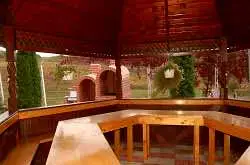 - Restaurantul, cu ferestre mari și vedere spre grădină, creează o ambianță plăcută, iar în lunile de vară mesele pot fi servite pe terasa exterioară sau în foișorul din grădină, înconjurați de natură.