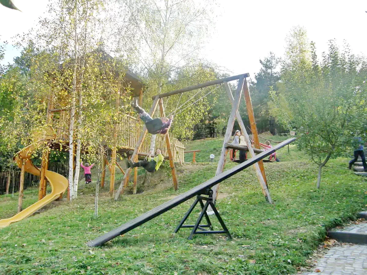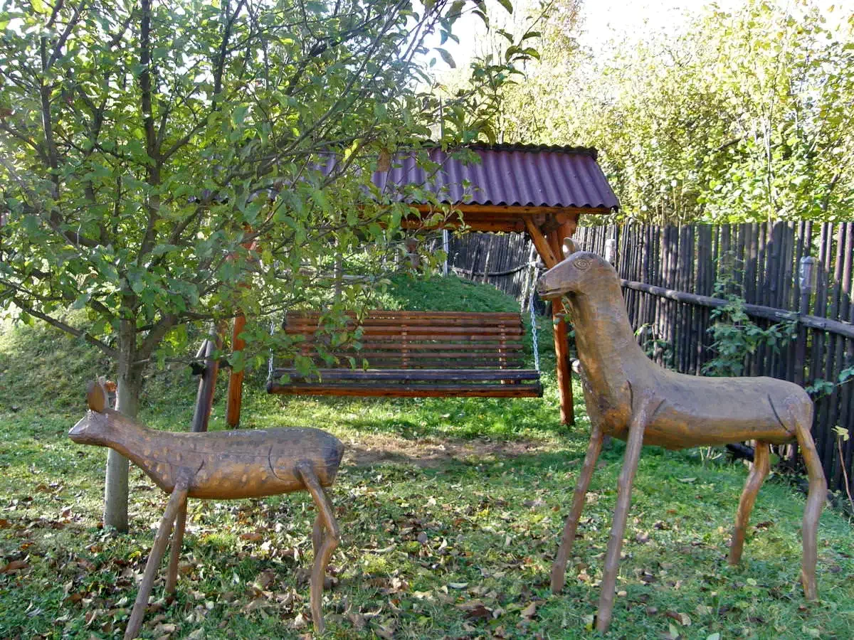 - În grădina amenajată se găsesc loc de joacă pentru copii, leagăne pentru relaxare și sculpturi din lemn reprezentând animale din pădure.