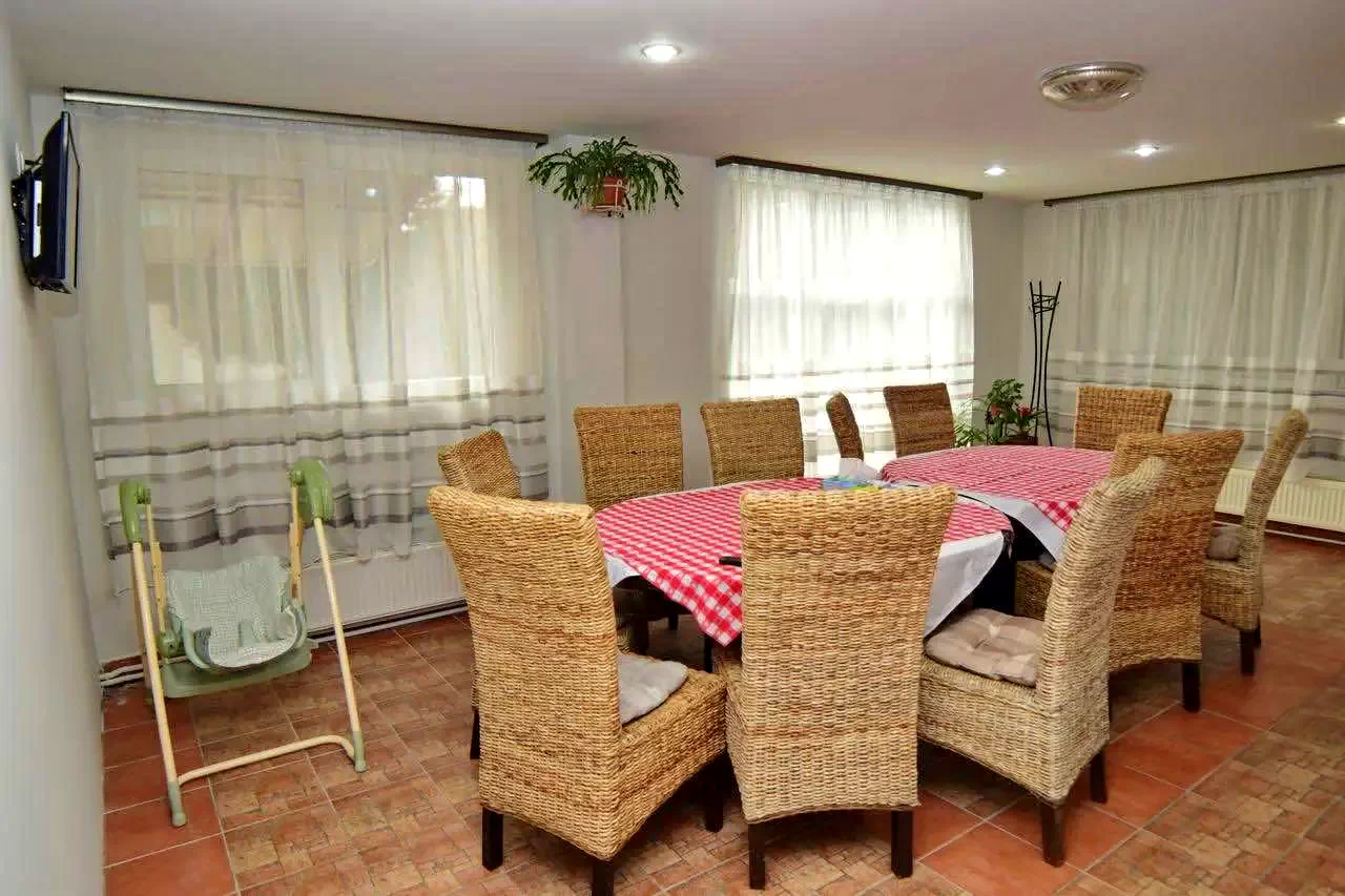 Pensiunea are bucătărie complet utilată, living cu TV, 6 camere confortabile cu baie proprie fiecare și televizor.