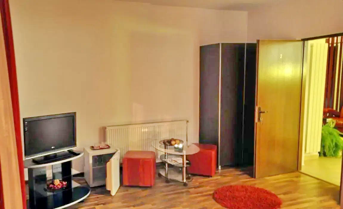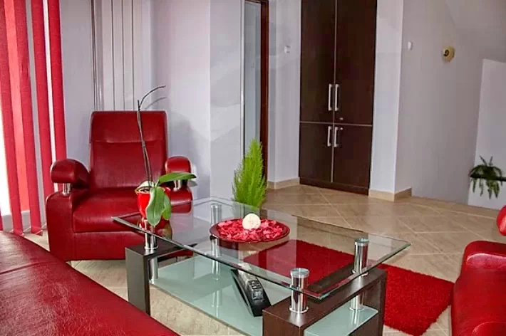 - apartament 1: 2 camere, una cu pat matrimonial, alta cu canapea si fotolii extensibile, baie proprie (38 mp)