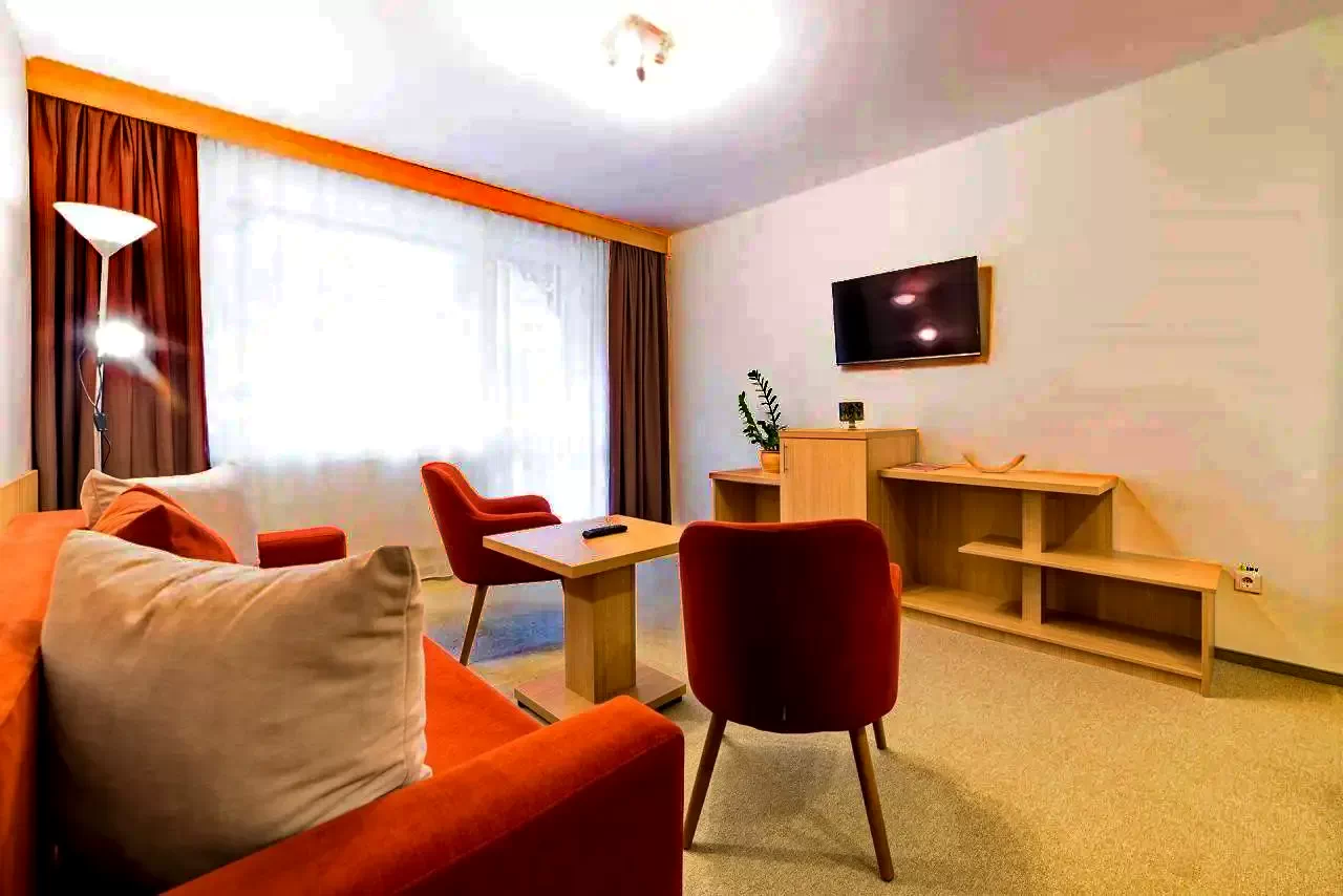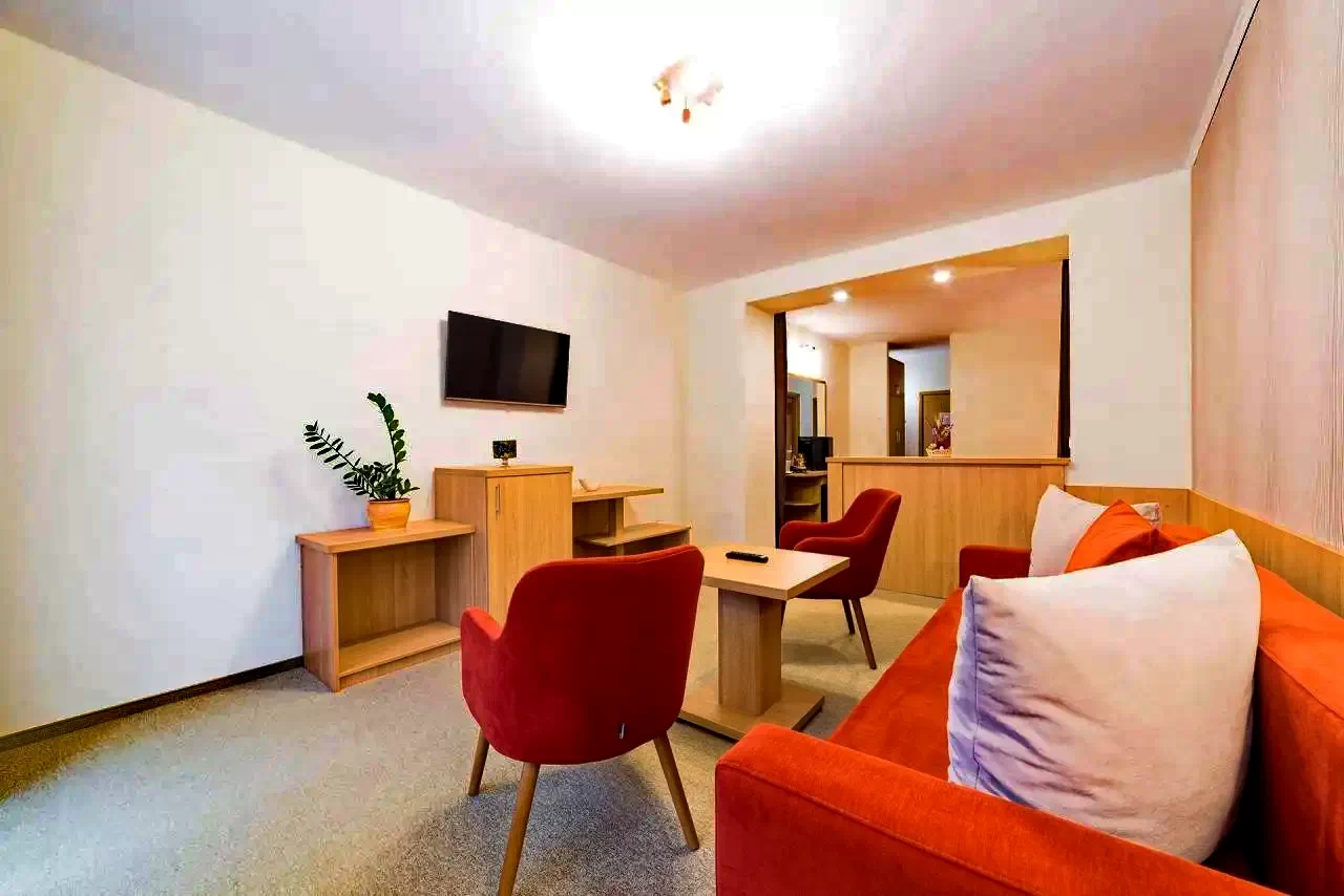 Camerele și apartamentele Hotelului sunt extrem de confortabile, luminoase, elegante, moderne si mobilate cu mult bun gust. Sunt dotate cu baie proprie, terasă, frigider, cablu TV, telefon și conexiune gratuită la internet.