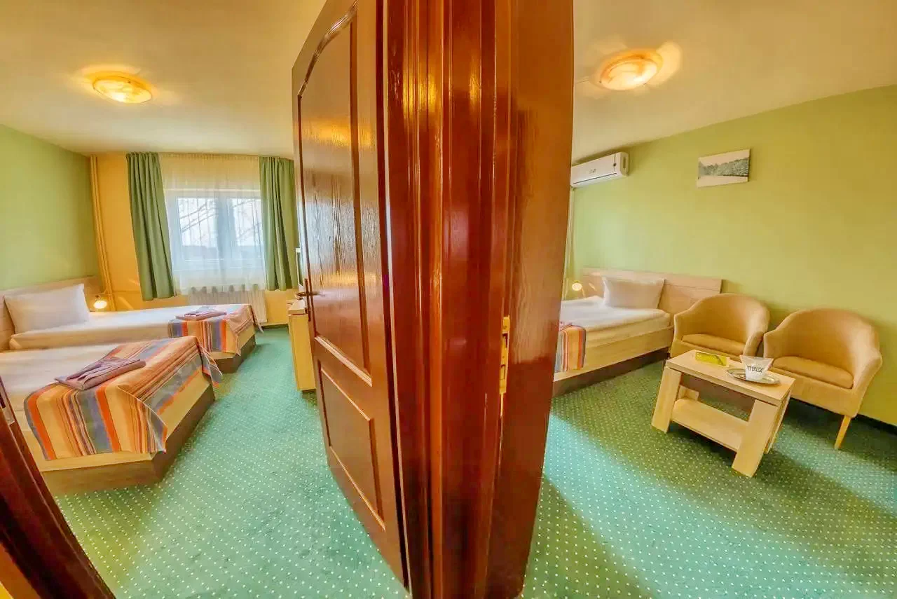 - 4 suite (2 camere cu baie comună, pat matrimonial și 2 paturi)