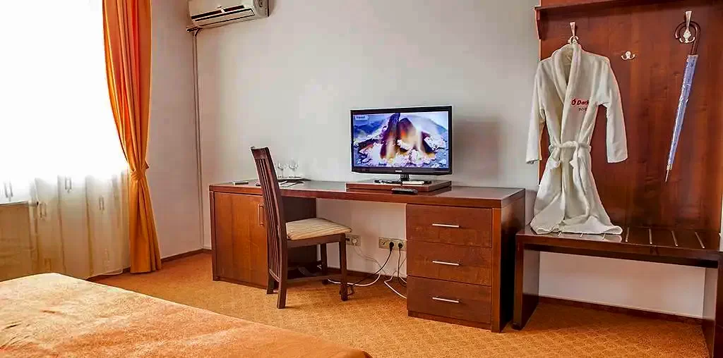 - Camerele acestui hotel sunt spaţioase, confortabile, indiferent dacă este vorba despre apartamente, camere în regim single sau duble. Mobilierul de cea mai bună calitate dă o notă distinctă întregului hotel.