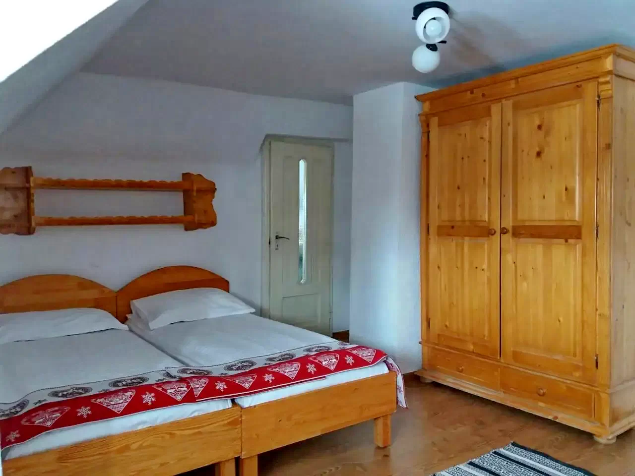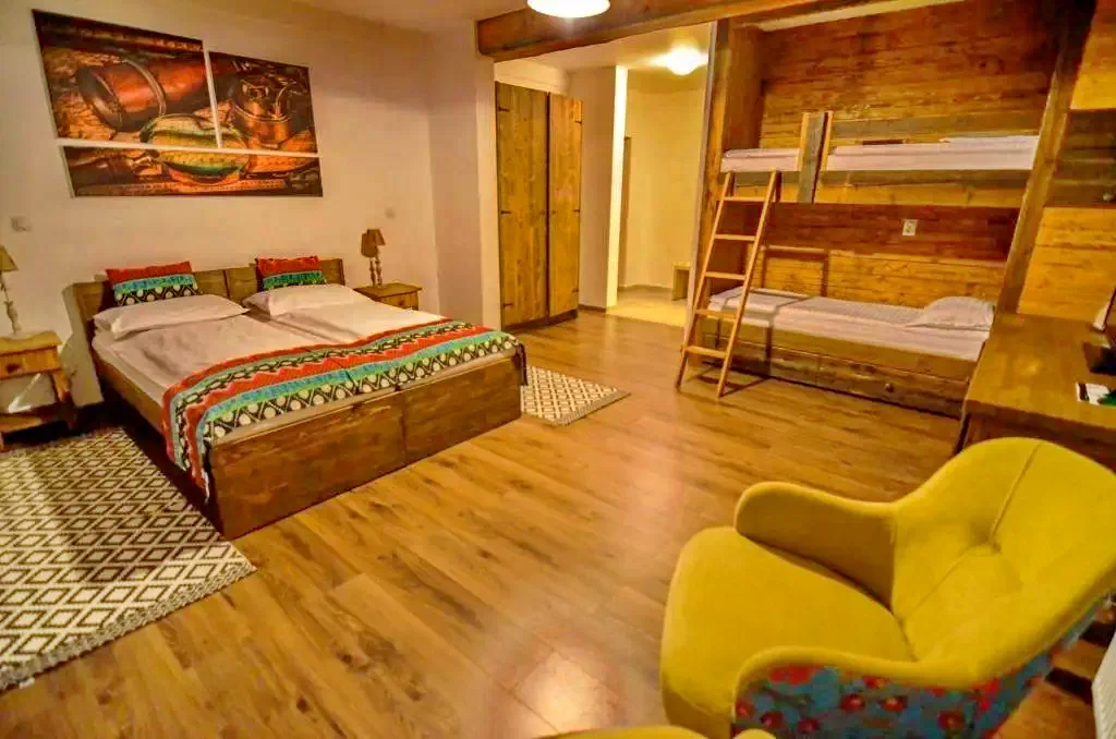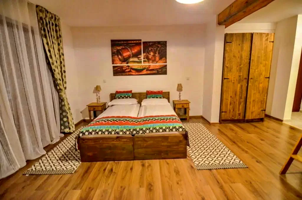 - două camere la etaj, fiecare cu câte un pat matrimonial și 1 pat suprapus (2 paturi de 1 persoană).