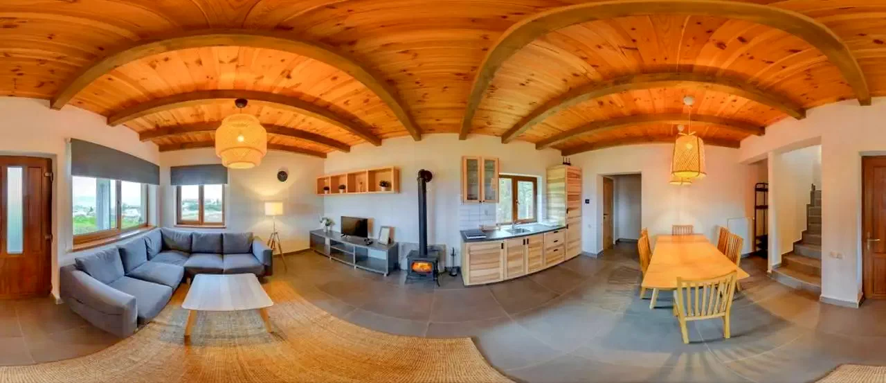 In livingul nostru, unde servim oaspetilor masa, am construit un semineu in care, in iernile friguroase, aprindem focul, pentru un plus de rasfat. In fata lui, citind o carte buna, cu un pahar de vin rosu in mana, viata este, pur si simplu, frumoasa.