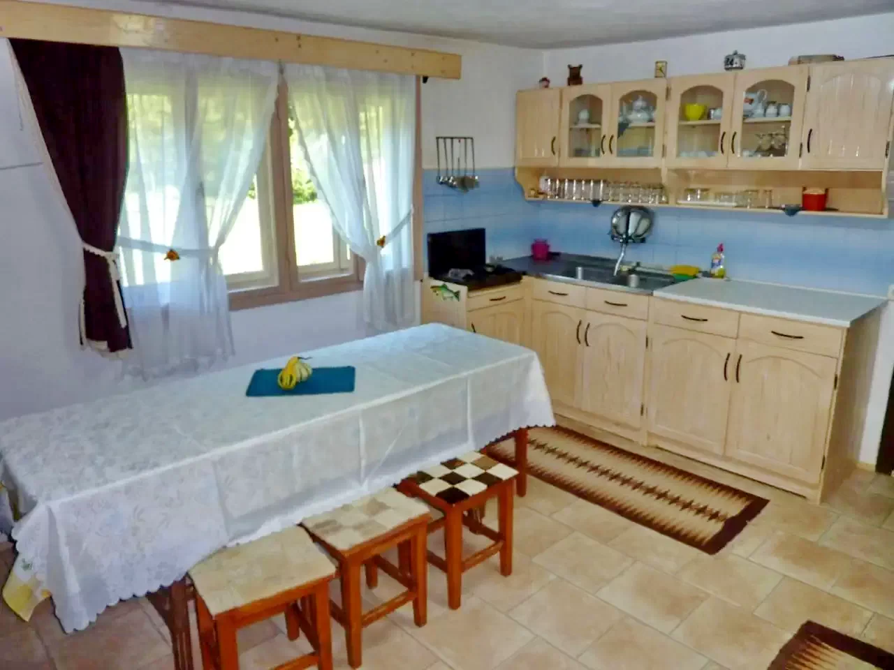 - Casa de vacanță dispune de o bucătărie complet utilată, care oferă toate echipamentele necesare: aragaz cu gaz, frigider, cafetieră, veselă și tacâmuri.