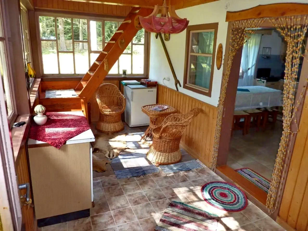 - La parter se află livingul, zona de luat masa, bucătăria, baia și două camere. Într-una dintre camere sunt trei paturi de o persoană, iar cealaltă cameră este dotată cu două paturi de o persoană.