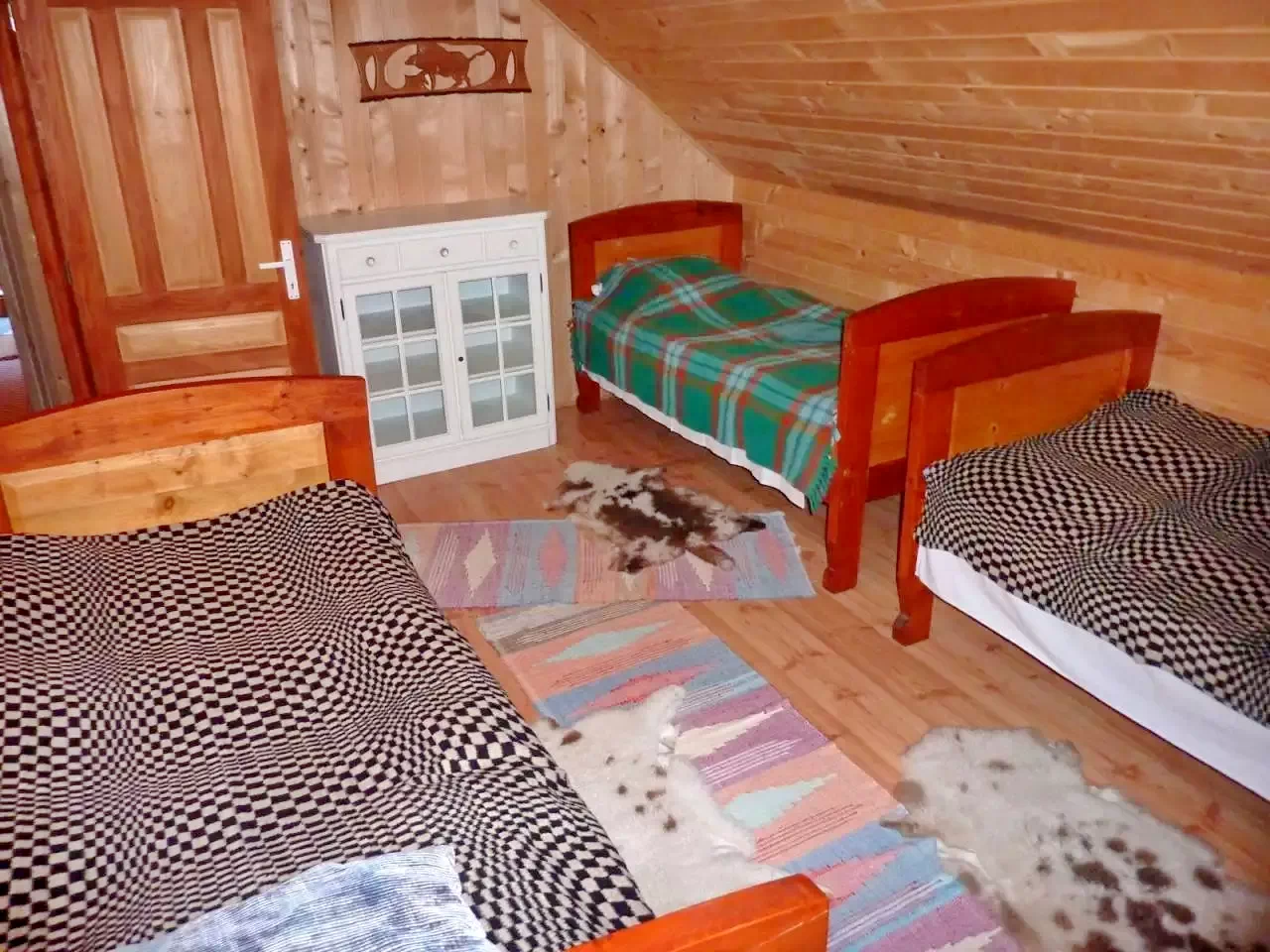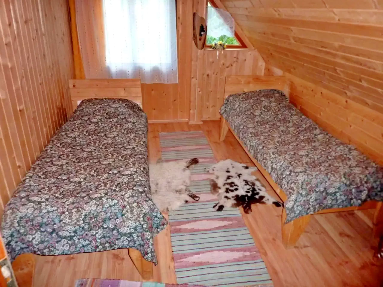 - Accesul la etaj se face pe o scară exterioară. La acest nivel, există un living, două camere și o toaletă. Una dintre camere are două paturi de o persoană, iar cealaltă cameră este dotată cu trei paturi de o persoană.