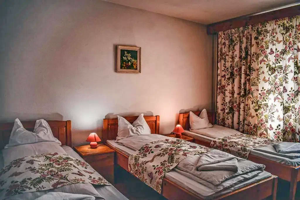 - 3 camere: Cu 3 paturi separate (dintre care 1 cameră triplă), cu baie privată pe hol, în apropiere.