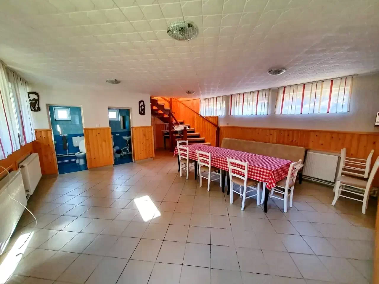 - La parter se află un living spațios cu zonă de luat masa (20–25 locuri), o bucătărie complet utilată și două toalete (cu WC și chiuvetă).