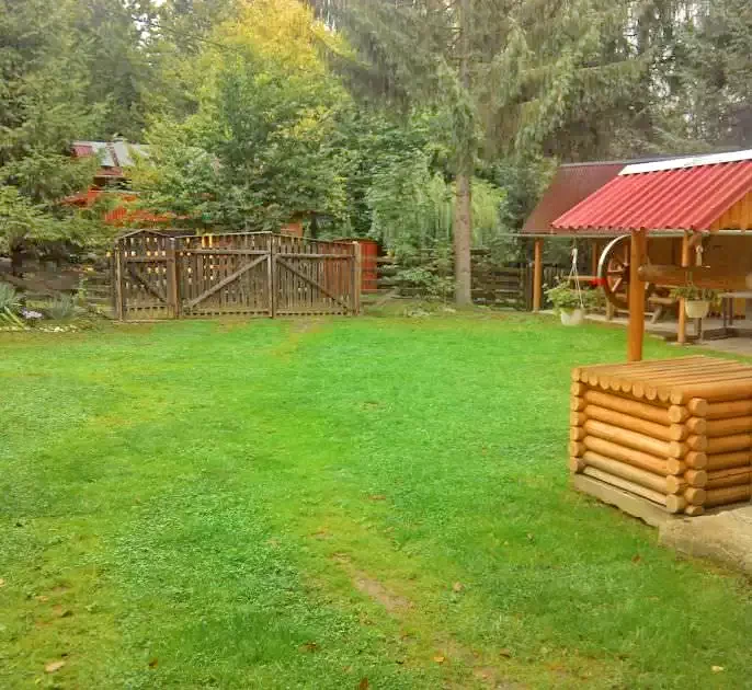 - Curtea spațioasă include foișor acoperit, leagăn, șezlonguri și posibilități de gătit în aer liber (grătar, ceaun, disc, cuptor pentru pâine).