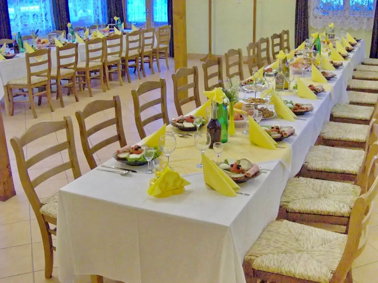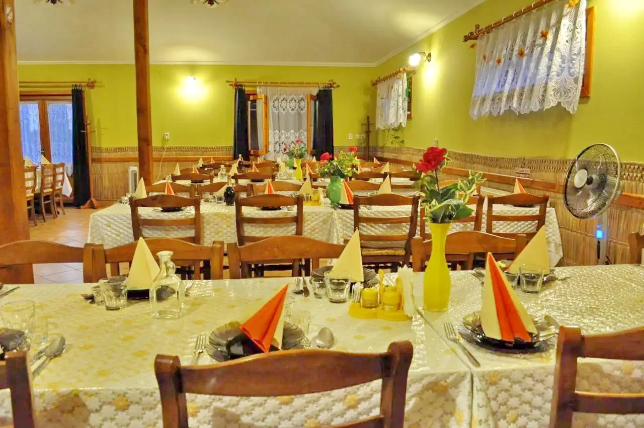 Opțional in sala de mese cu dorate moderna si eleganta servește masa (mic dejun, prânz, cină) la cerere. Grupurile organizate sunt servite cu oferte de cazare si masa atractive. Cu pensiunile vecine partenere poate caza si 2-3 grupuri mari organizate de 50-60 de persoane.